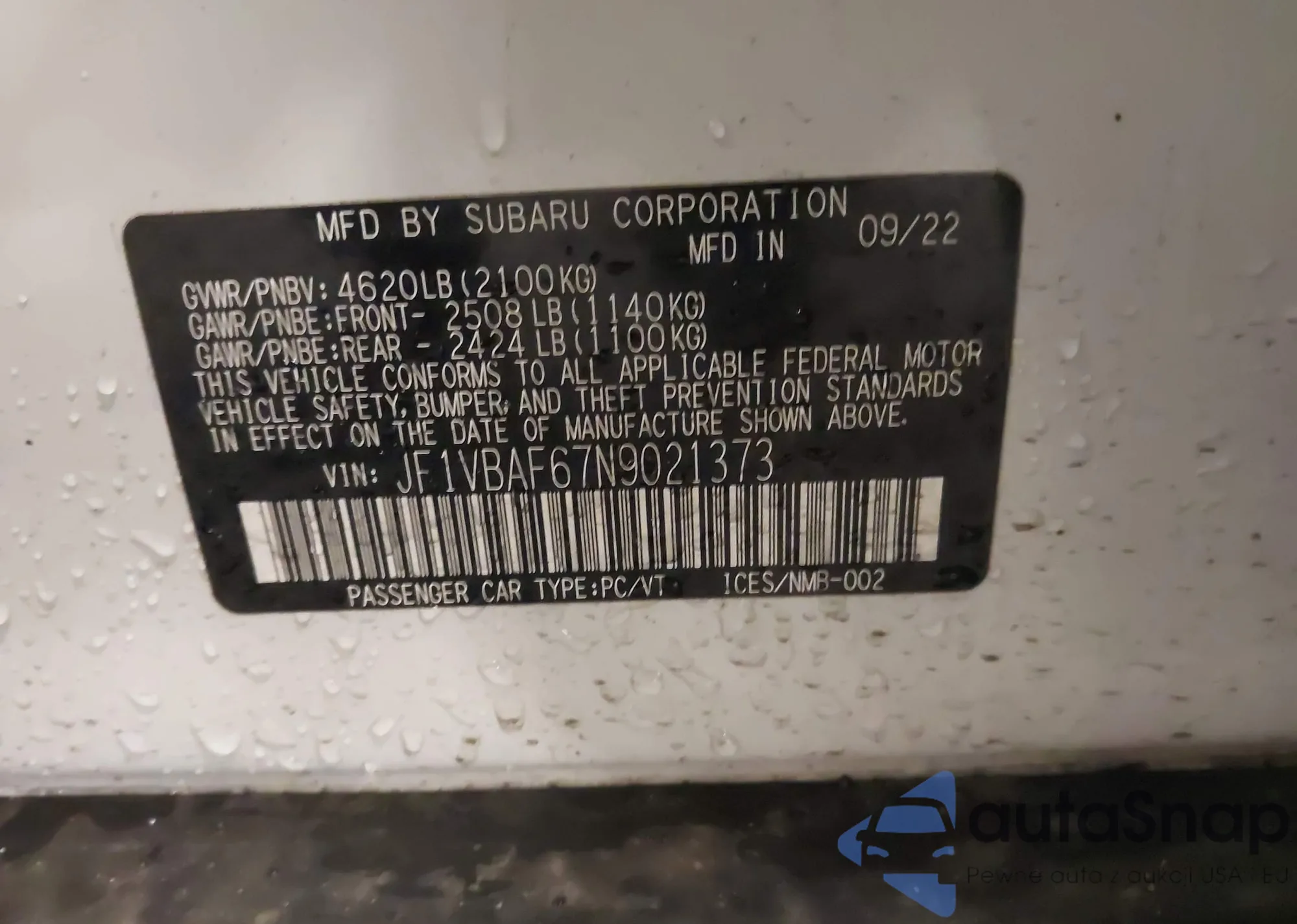 LOT: 43900379 VIN: JF1VBAF67N9021373