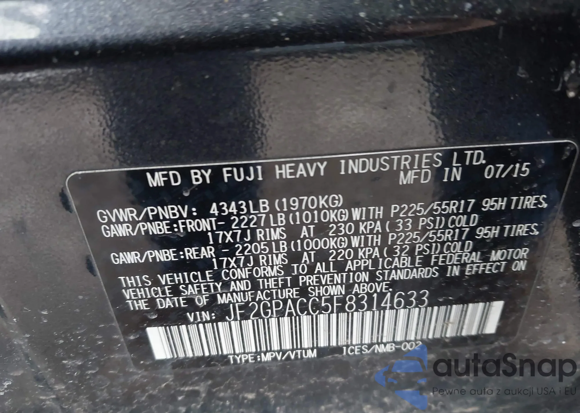 LOT: 43987158 VIN: JF2GPACC5F8314633
