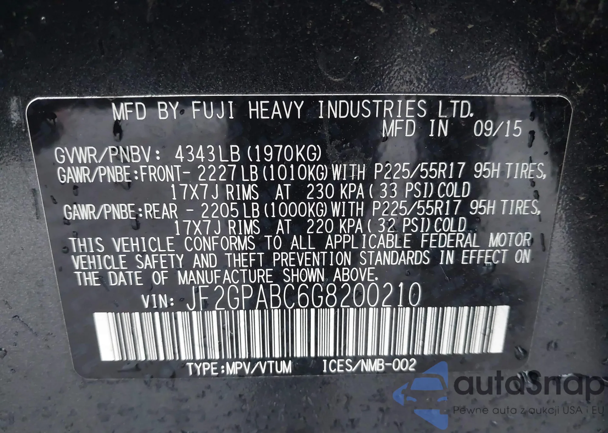 LOT: 91455915 VIN: JF2GPAFC9F8319975