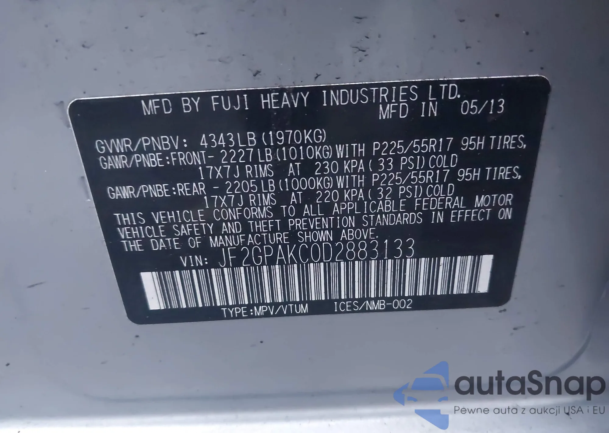 LOT: 44126337 VIN: JF2GPAKC0D2883133