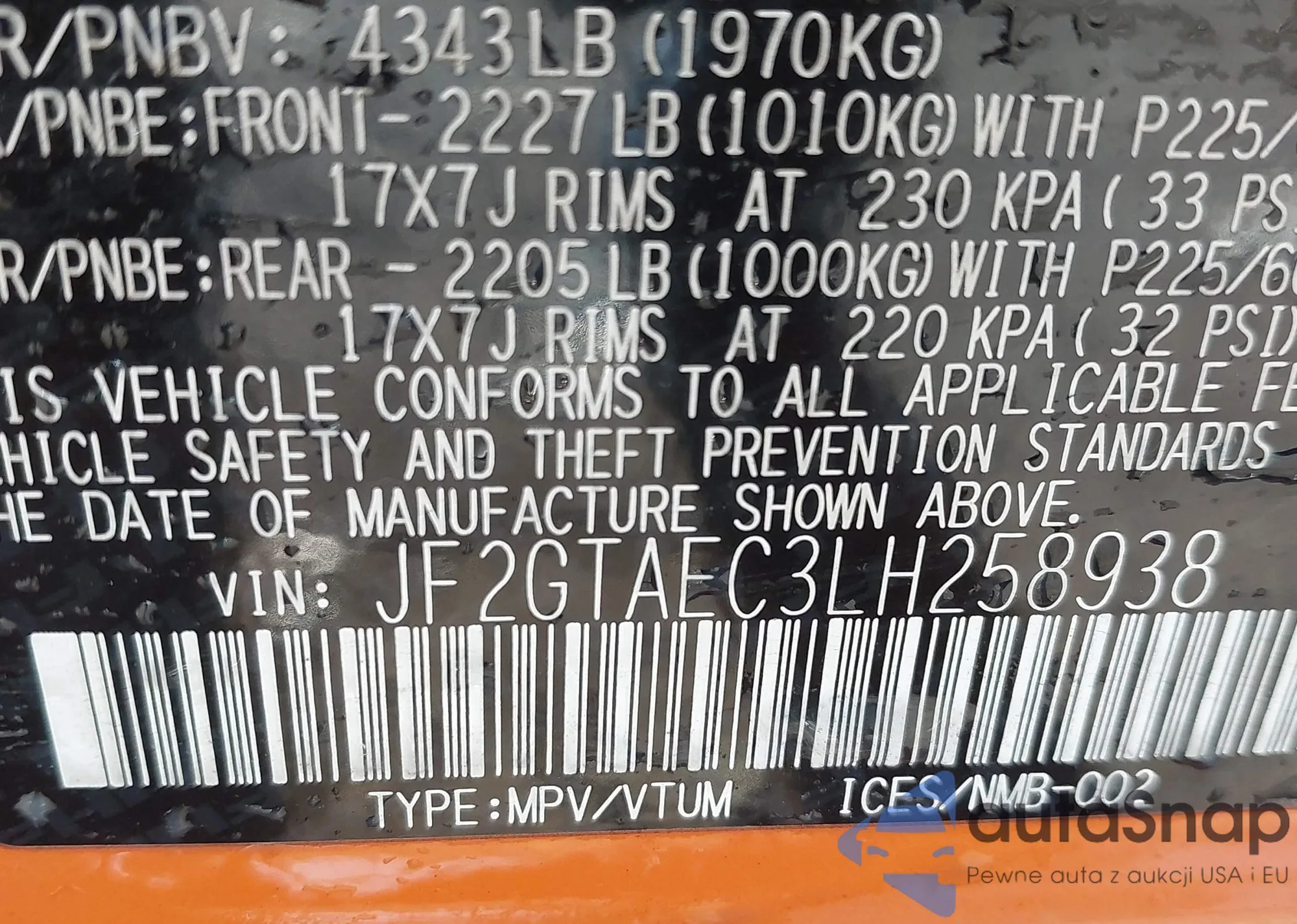 LOT: 43572133 VIN: JF2GTAEC3LH258938