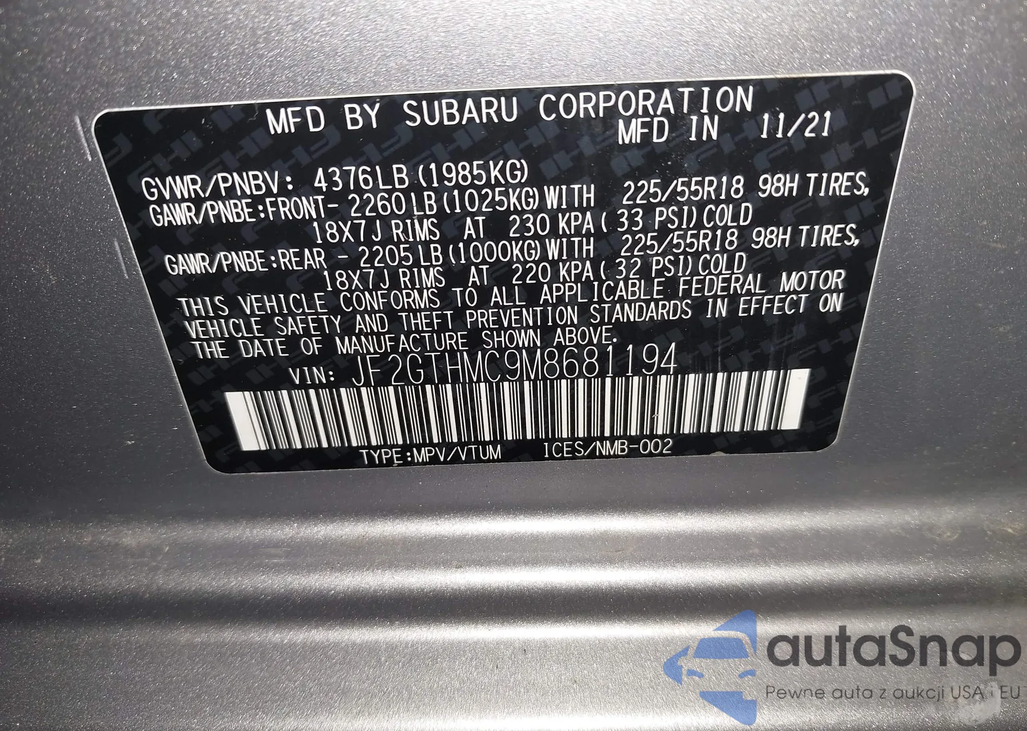 • VIN JF2GTHMC9M8681194