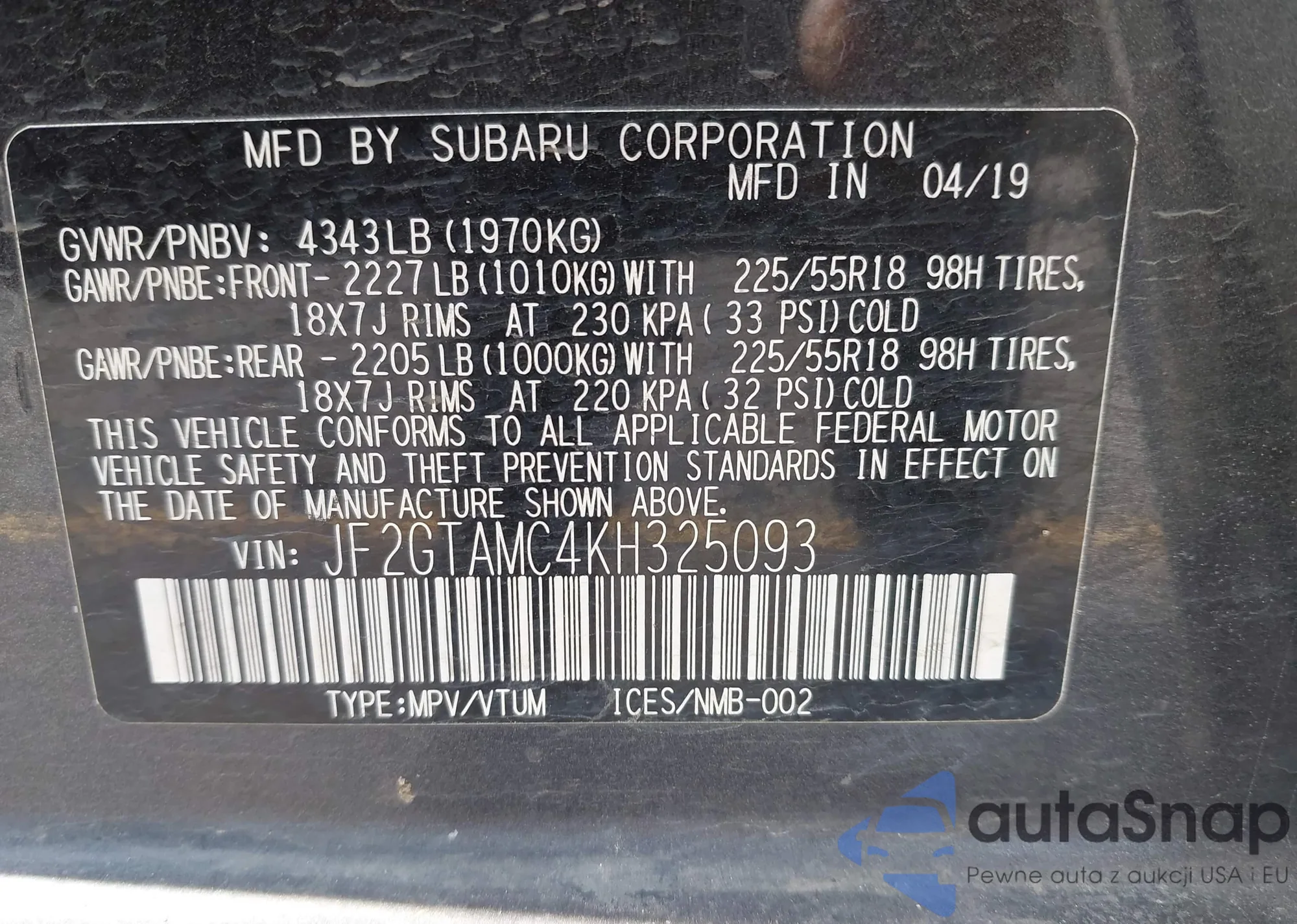 • VIN JF2GTAMC4KH325093