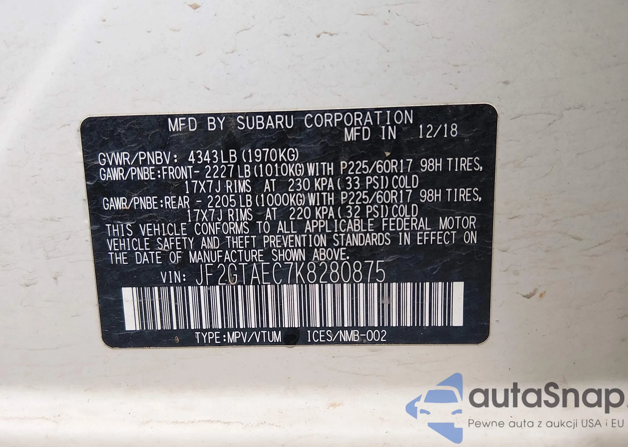 LOT: 44344344 VIN: JF2GTAEC7K8280875