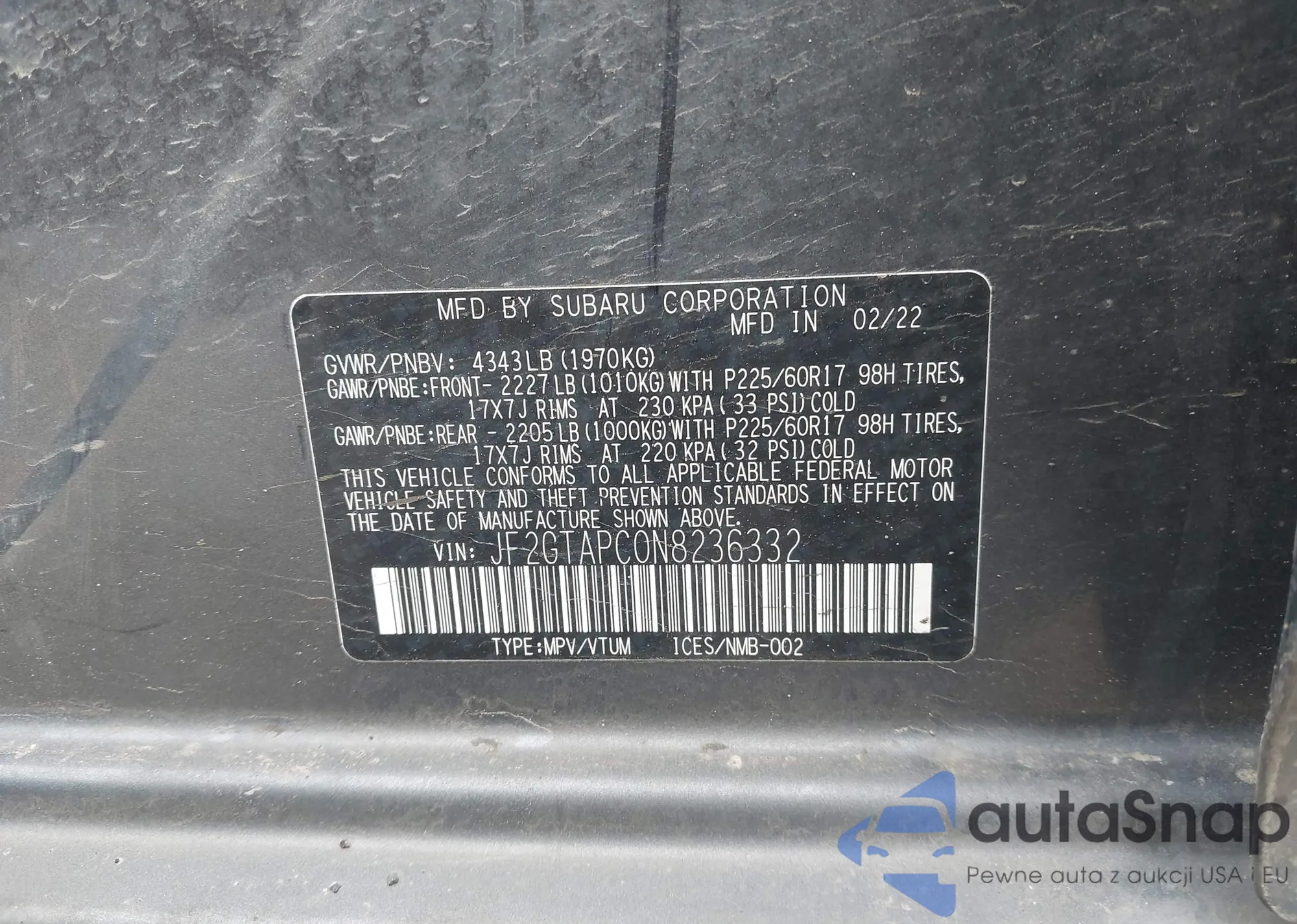 • VIN JF2GTAPC0N8236332