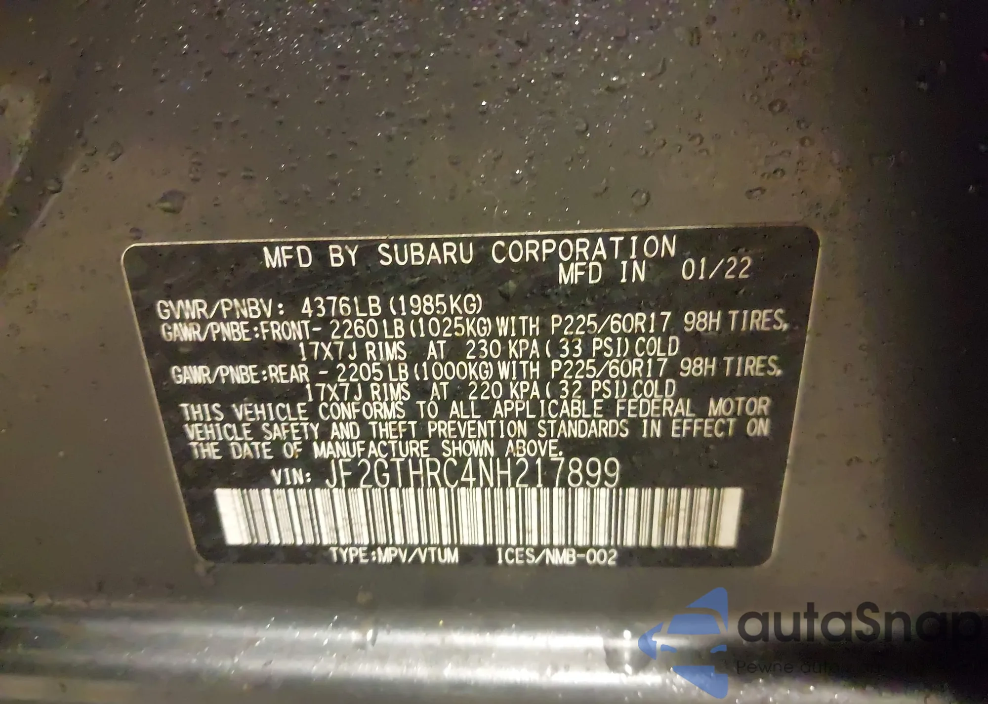 • VIN JF2GTHRC4NH217899