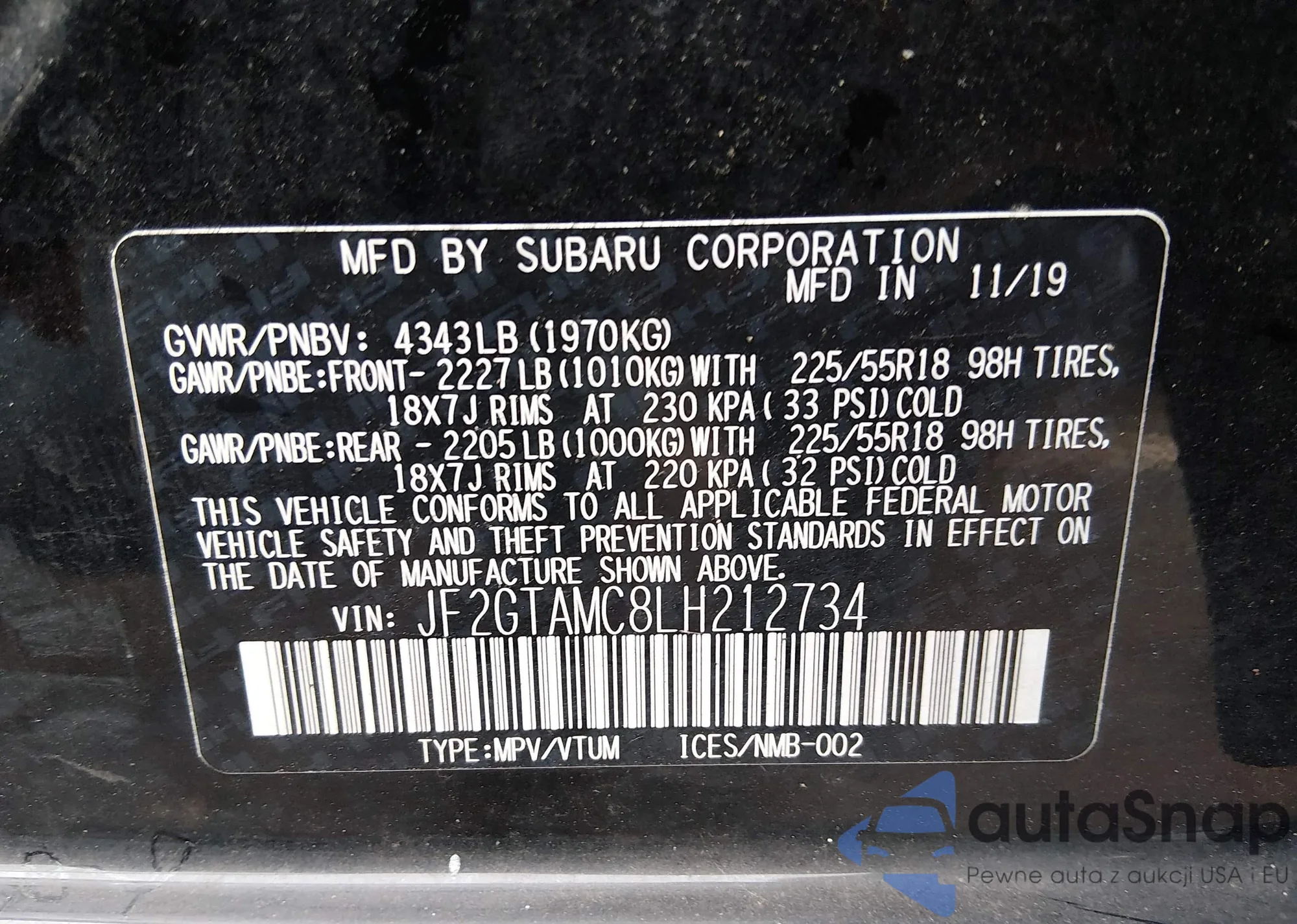 LOT: 44323967 VIN: JF2GTAMC4KH325093