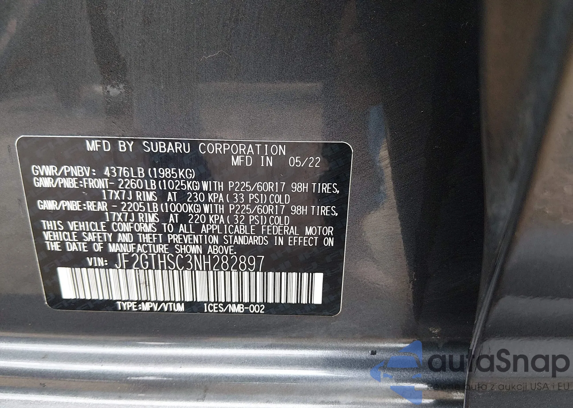 LOT: 44420591 VIN: JF2GTHSC3NH282897