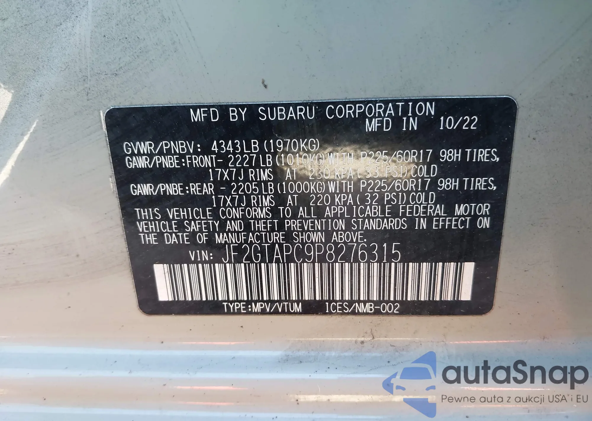 • VIN JF2GTAPC9P8276315