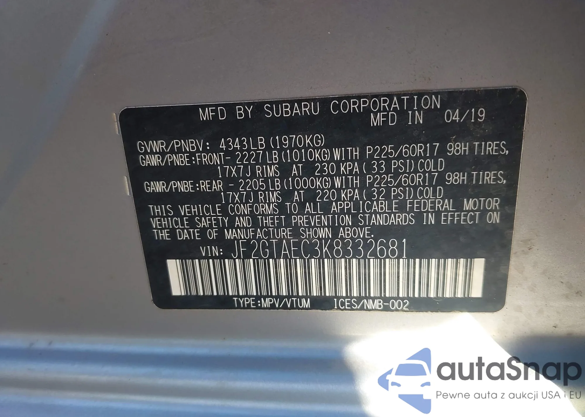 LOT: 43644786 VIN: JF2GTAEC3K8332681