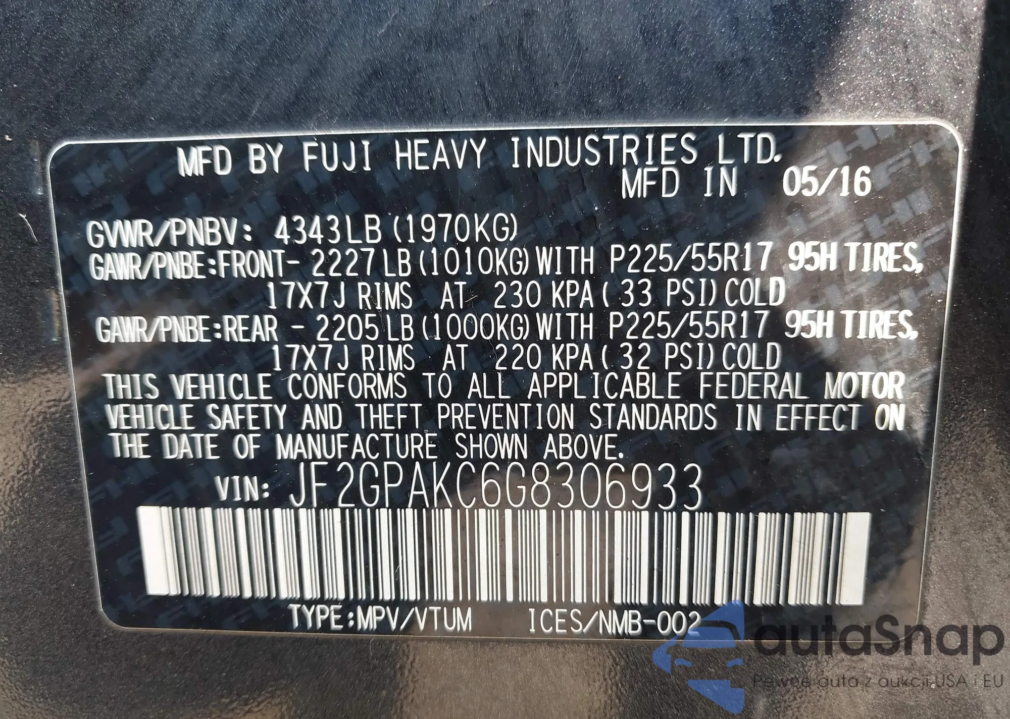 • VIN JF2GPAKC6G8306933