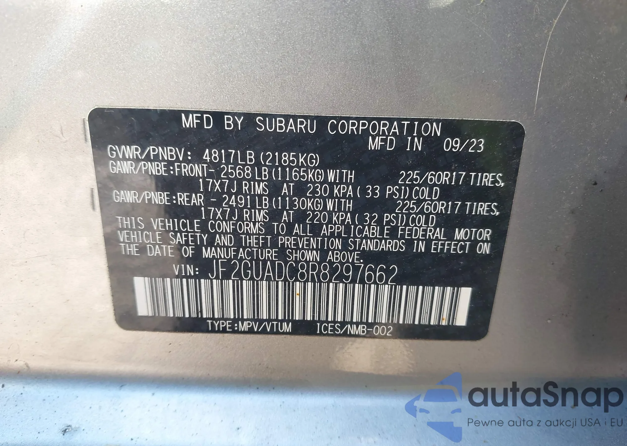 LOT: 43389582 VIN: JF2GPANC5H8237844