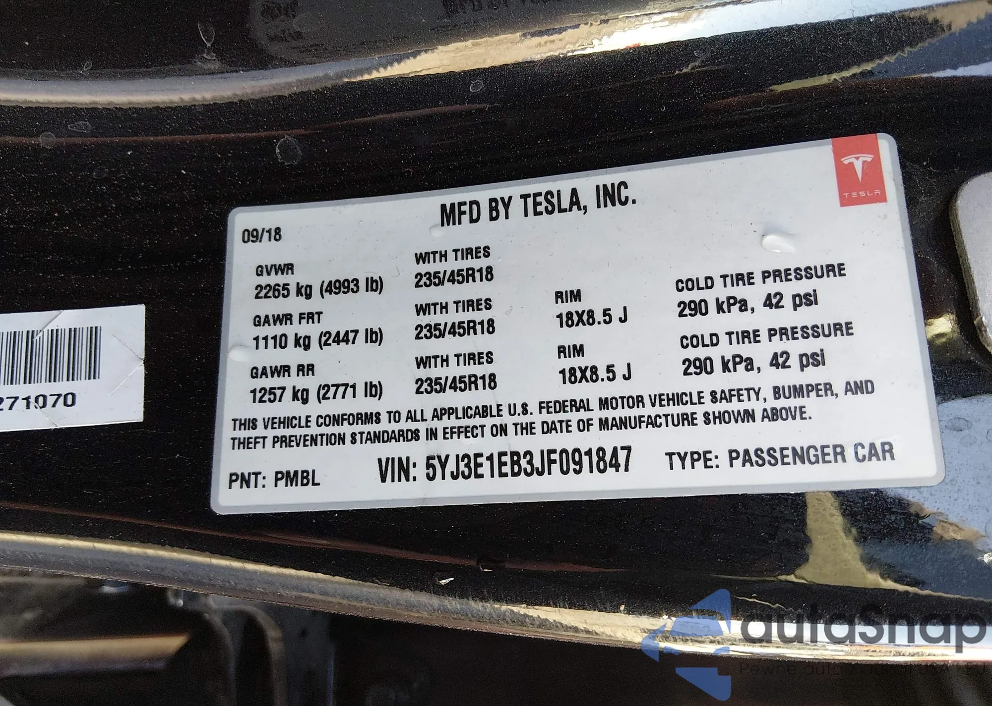 • VIN 5YJ3E1EB3JF091847