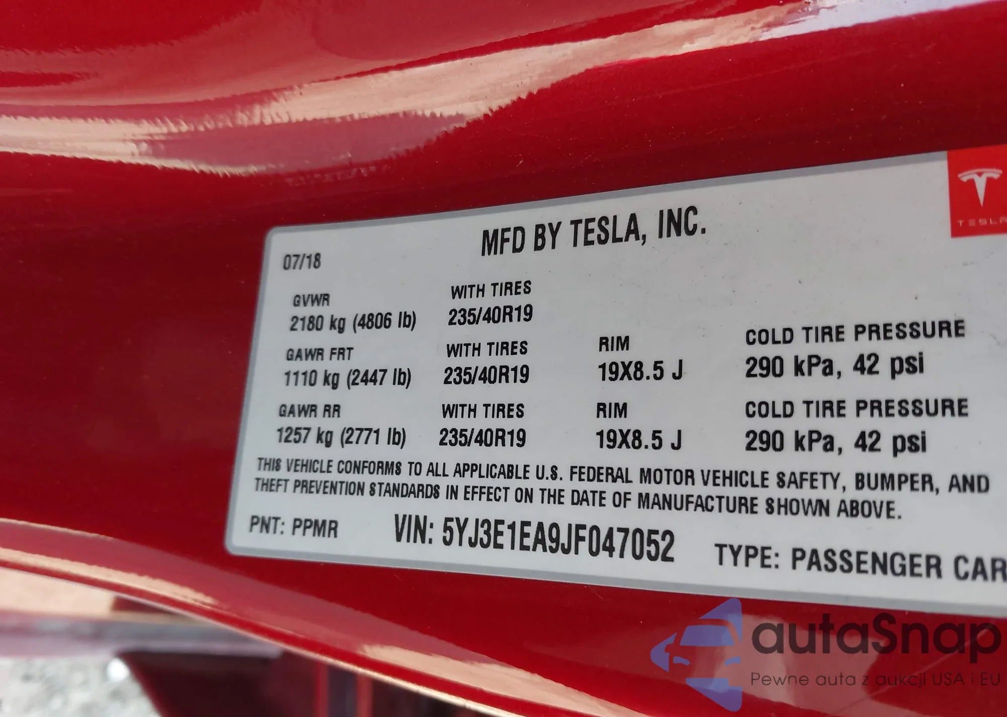 • VIN 5YJ3E1EA9JF047052