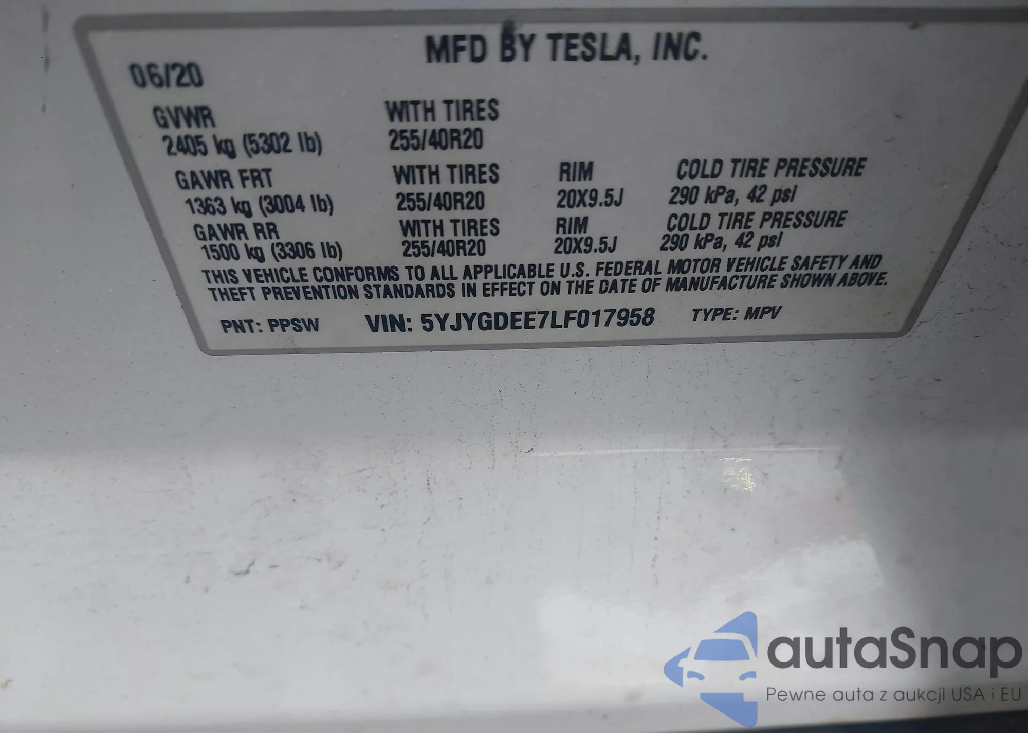 LOT: 43505922 VIN: 5YJYGDEE7LF017958