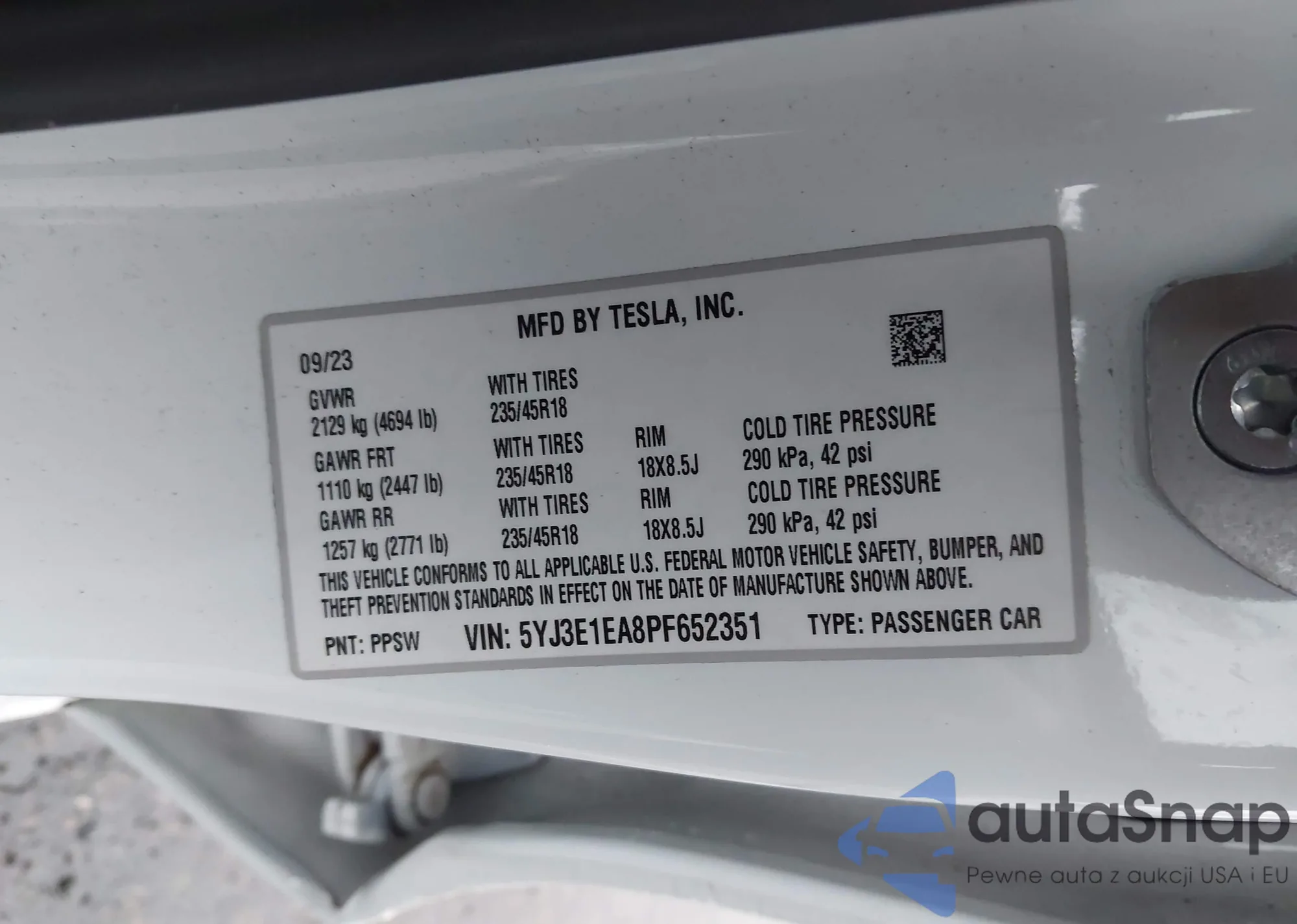 • VIN 5YJ3E1EA8PF652351