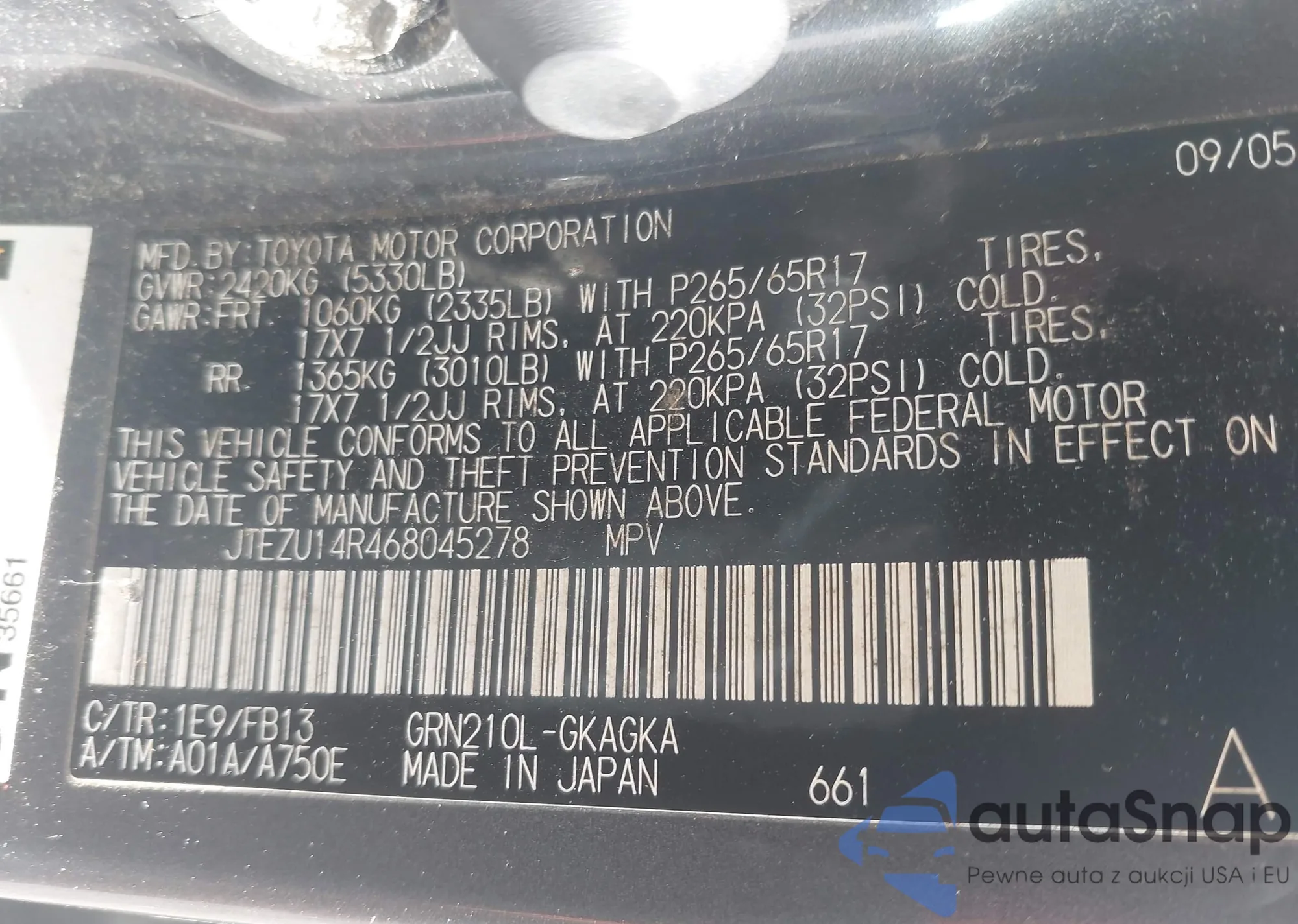 LOT: 42997706 VIN: JTEZU14R468045278