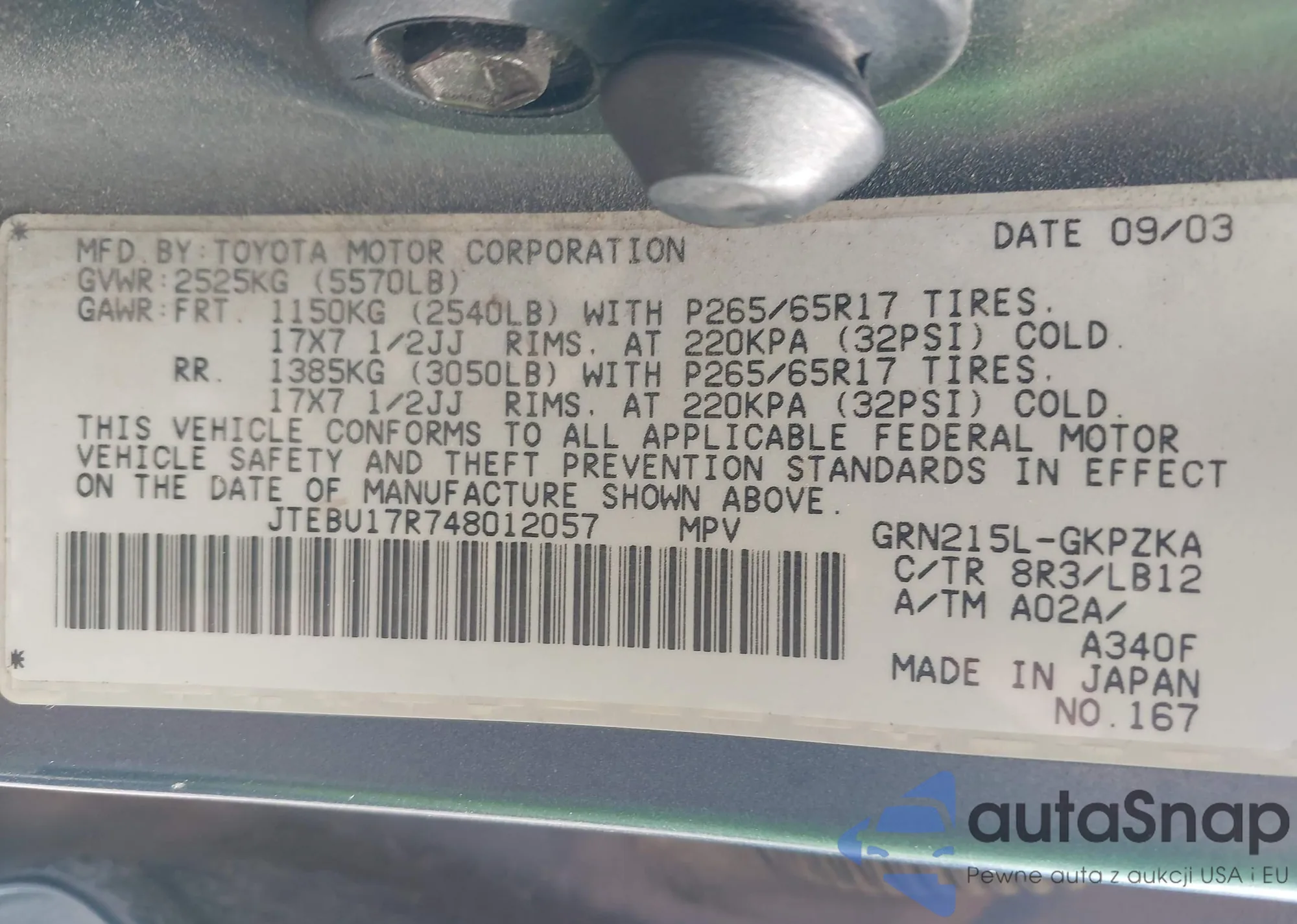 LOT: 69174575 VIN: JTEBT17R98K005767