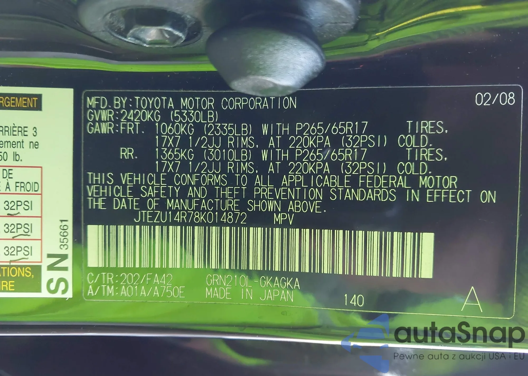 LOT: 36875763 VIN: JTEZU14R18K004418