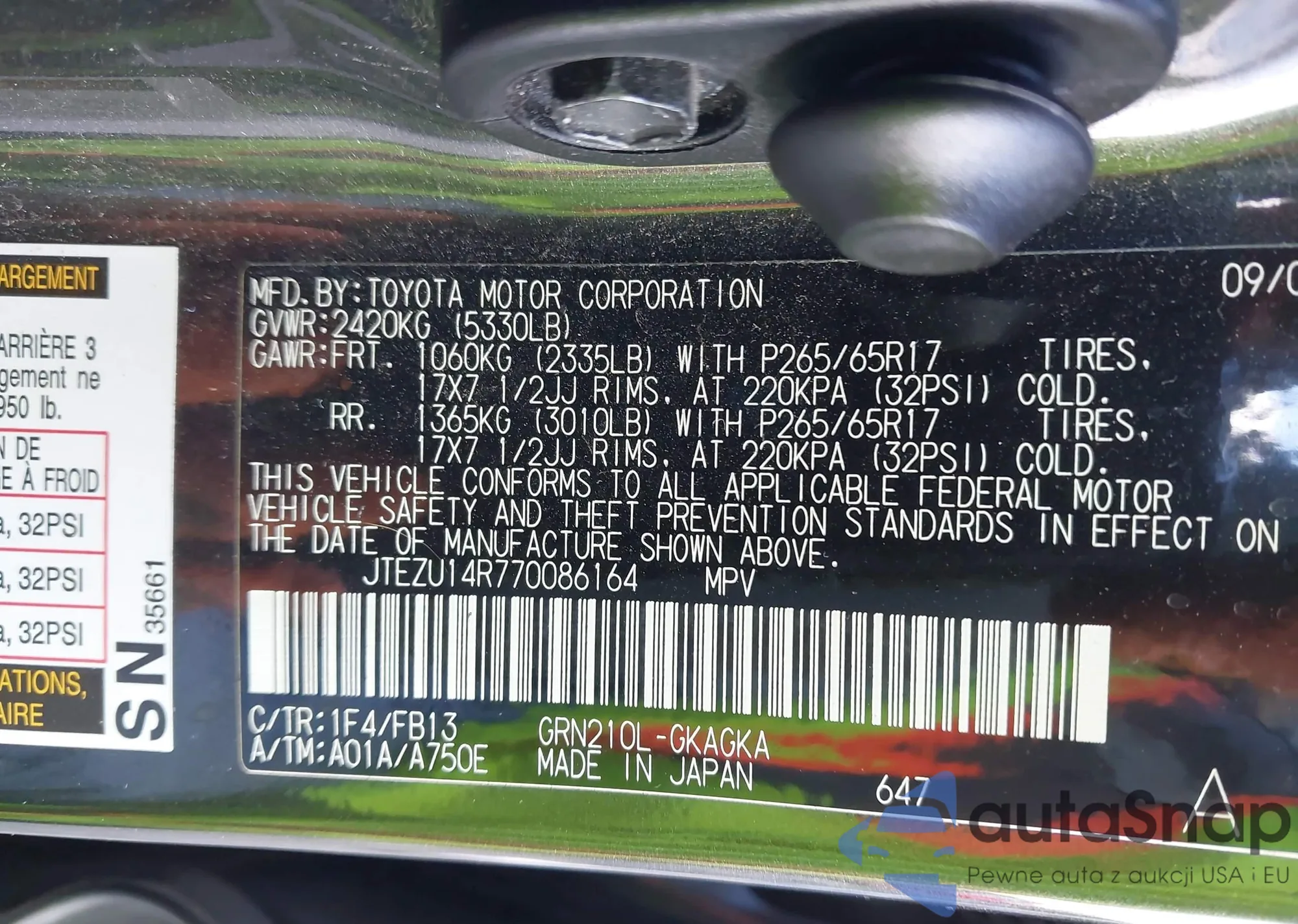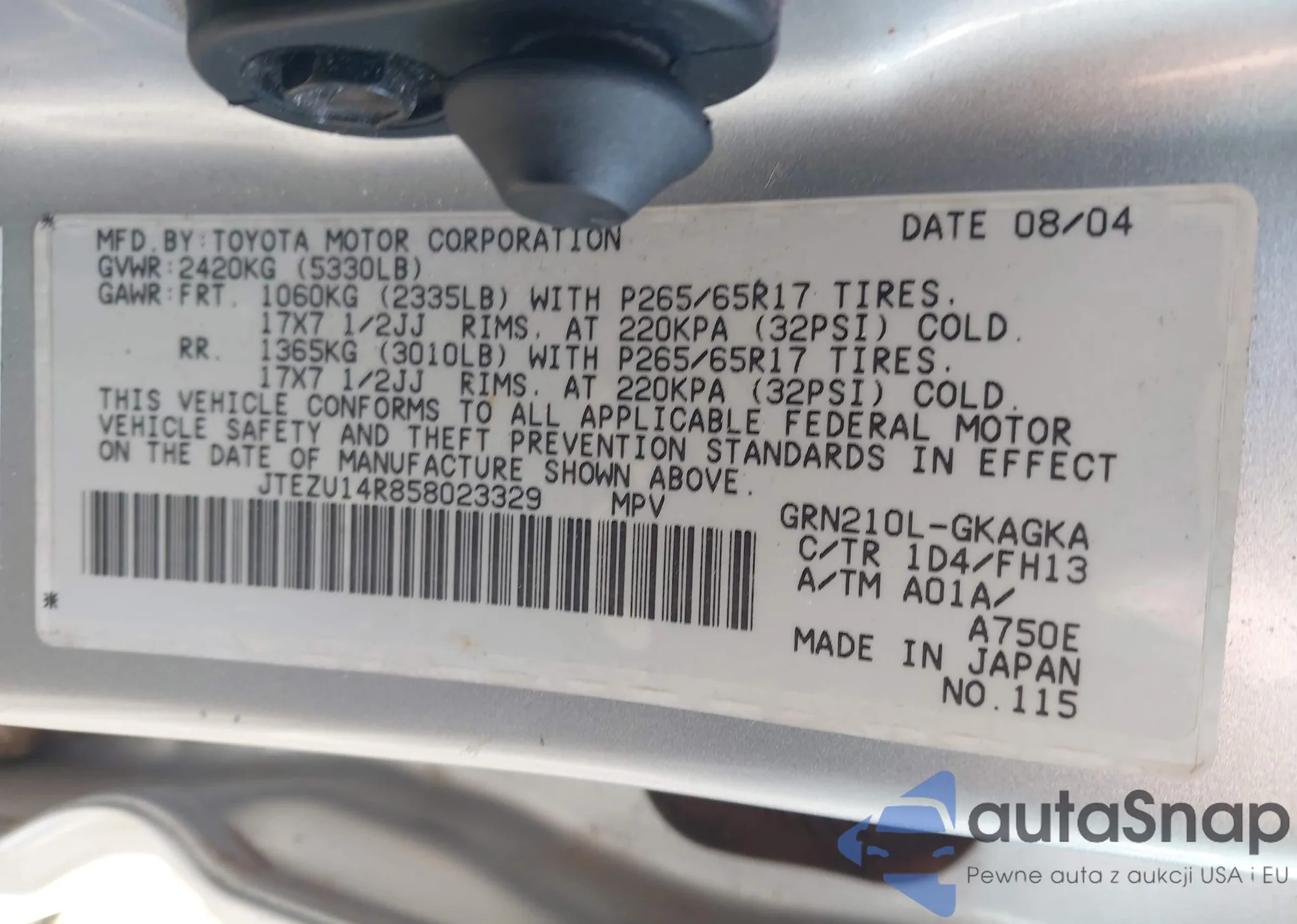 LOT: 43716849 VIN: JTEBT17R050046005