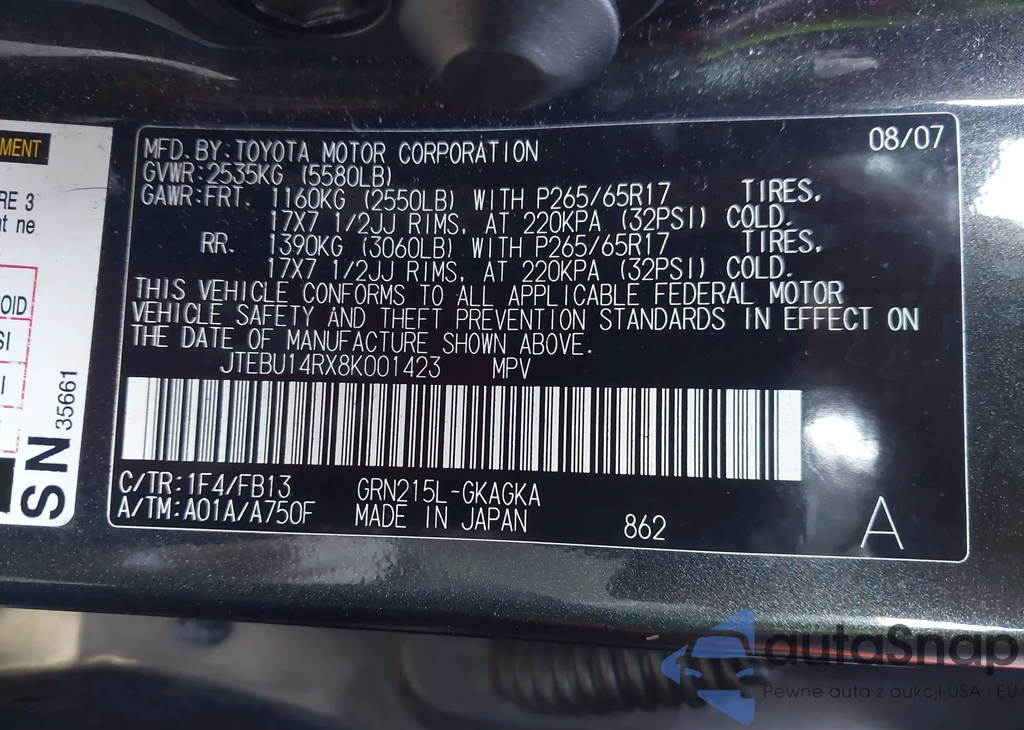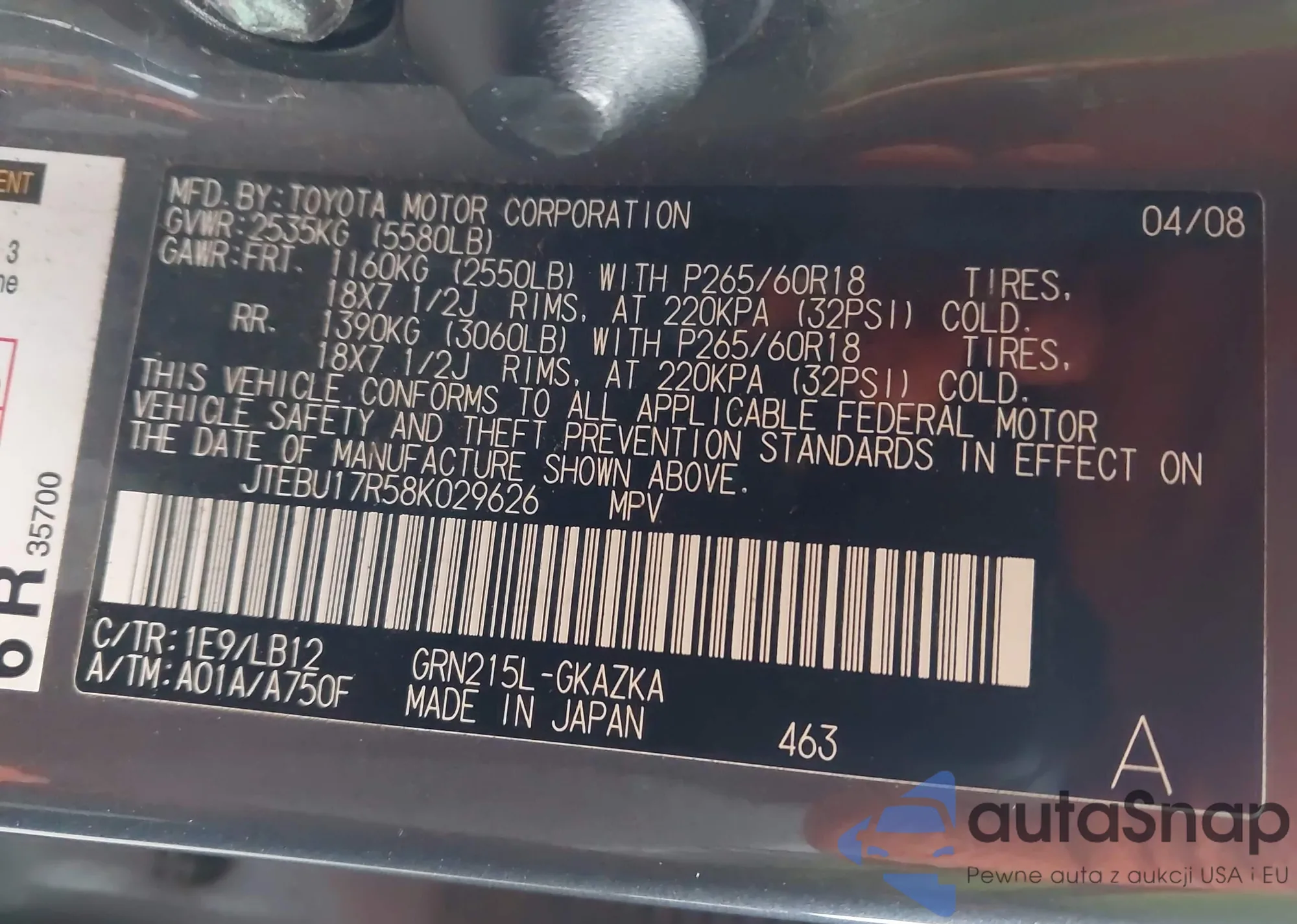 LOT: 44265801 VIN: JTEBU17R58K029626