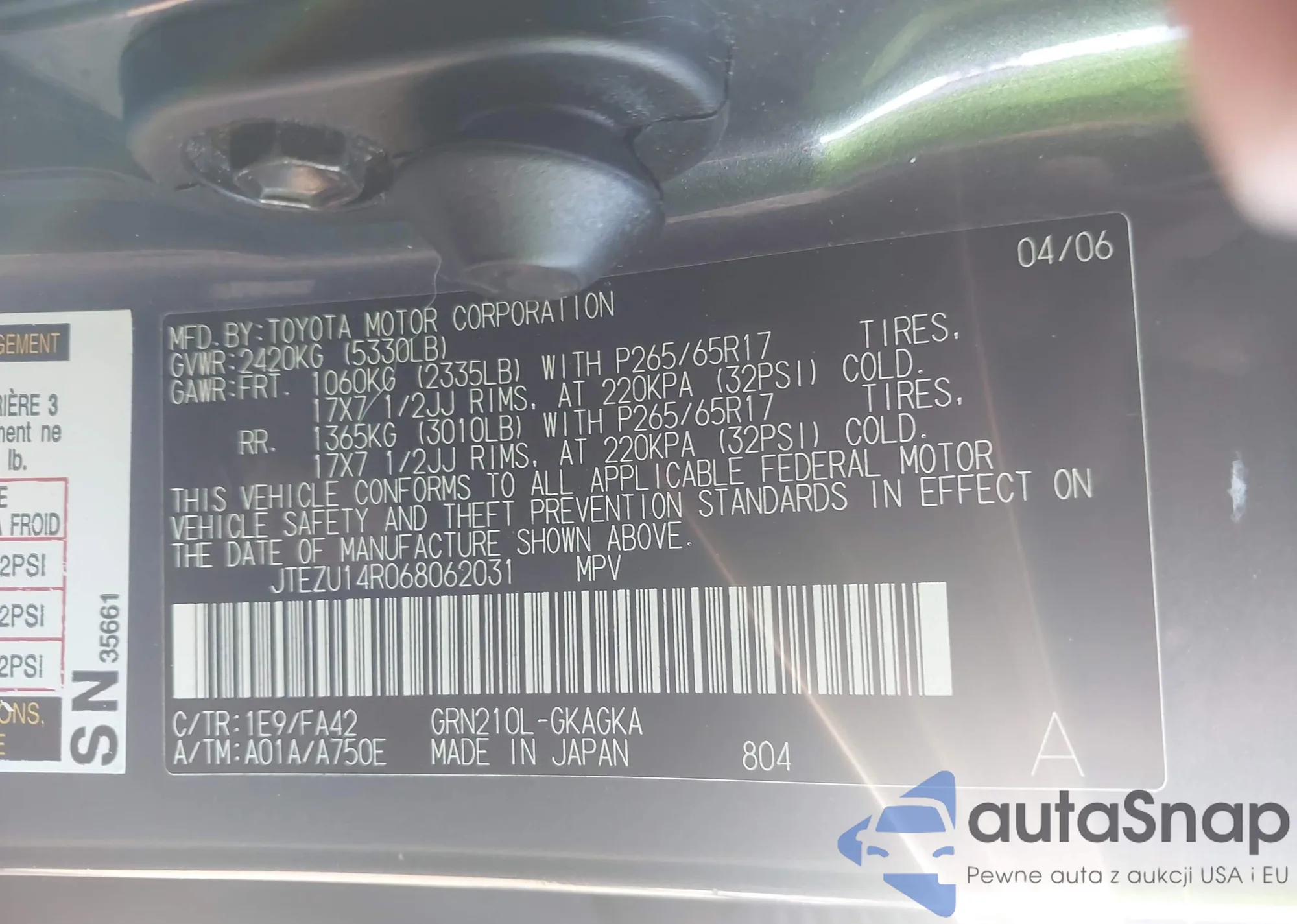 LOT: 44280482 VIN: JTEZU14R068062031