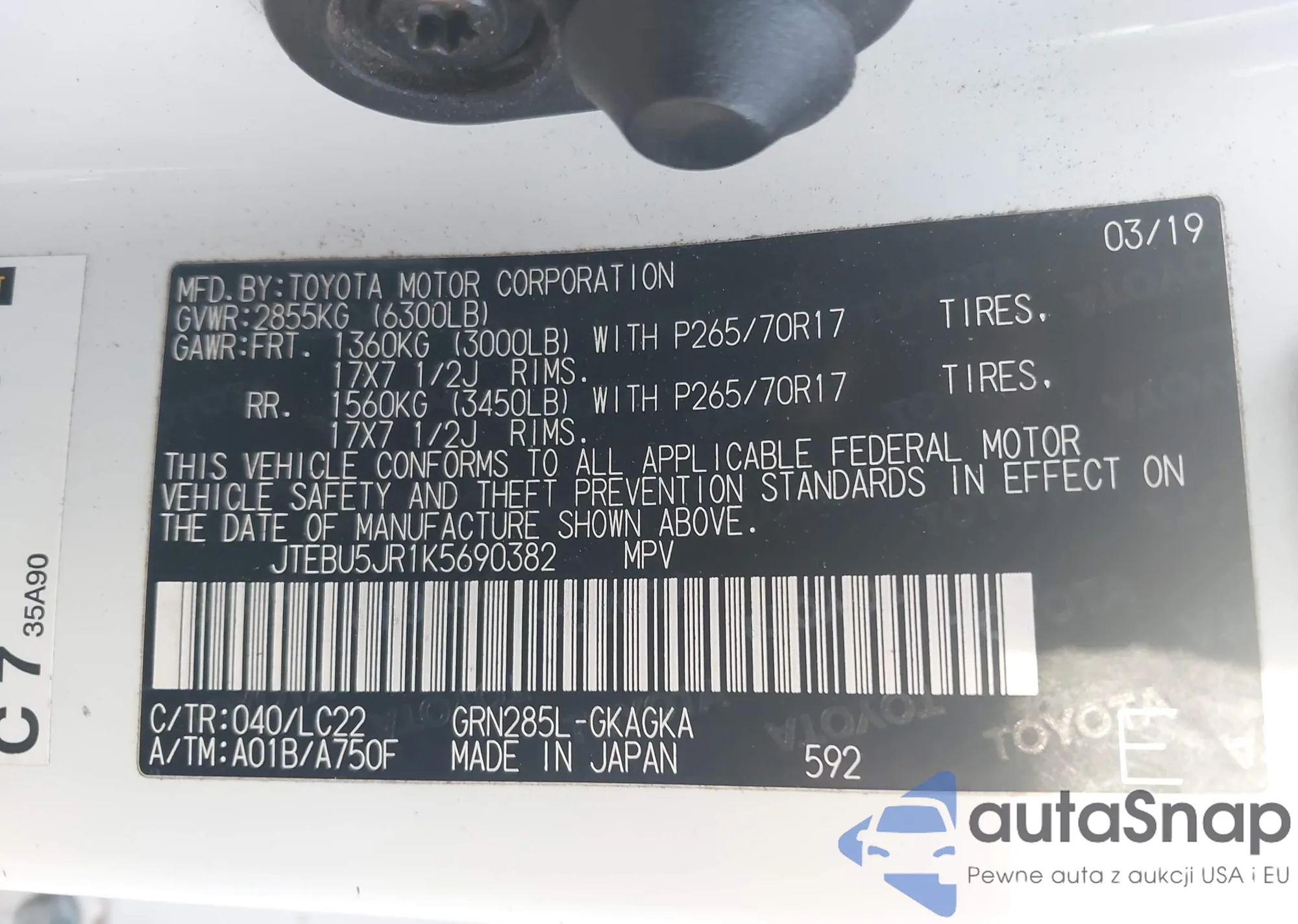 LOT: 44009462 VIN: JTEBU5JR1K5690382