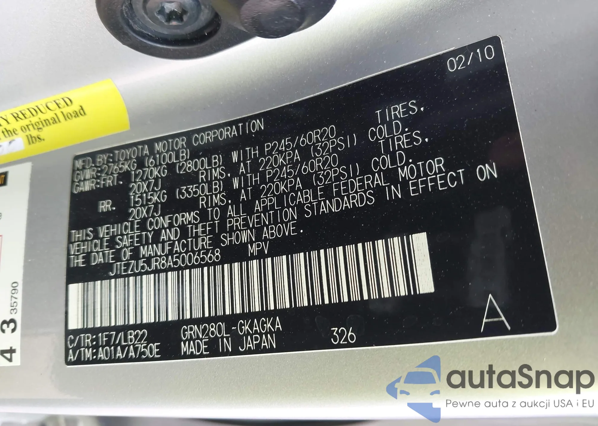 LOT: 44137727 VIN: JTEZU5JR8A5006568