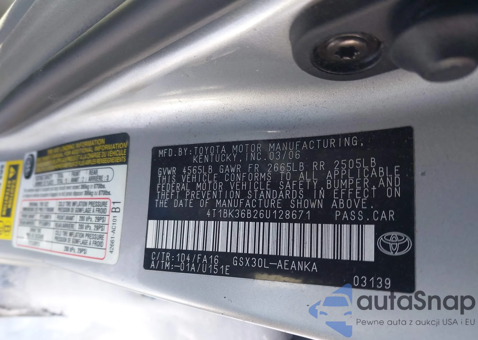 LOT: 44279681 VIN: 4T1BK36B26U070867