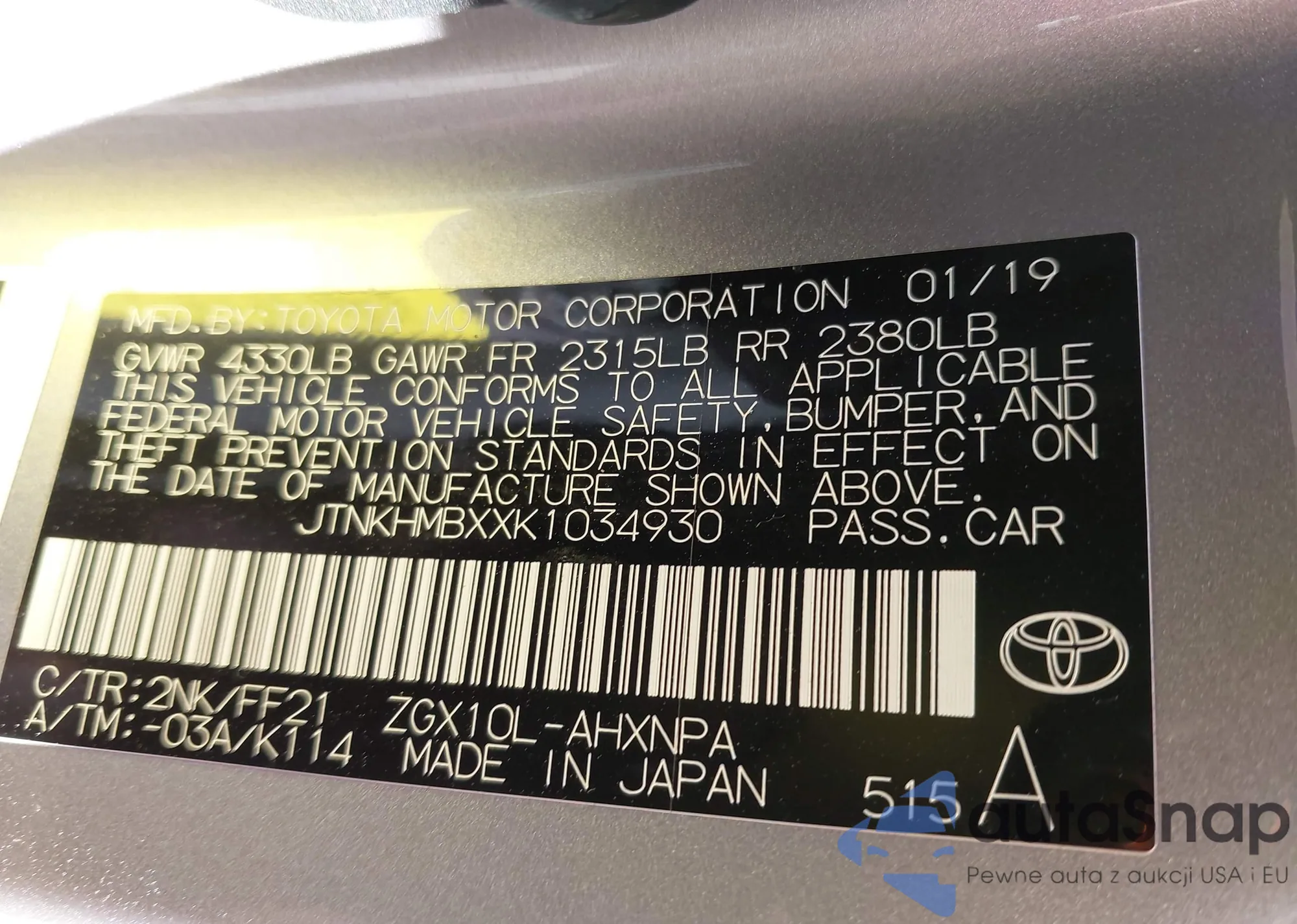 LOT: 44549643 VIN: JTNKHMBXXK1034930