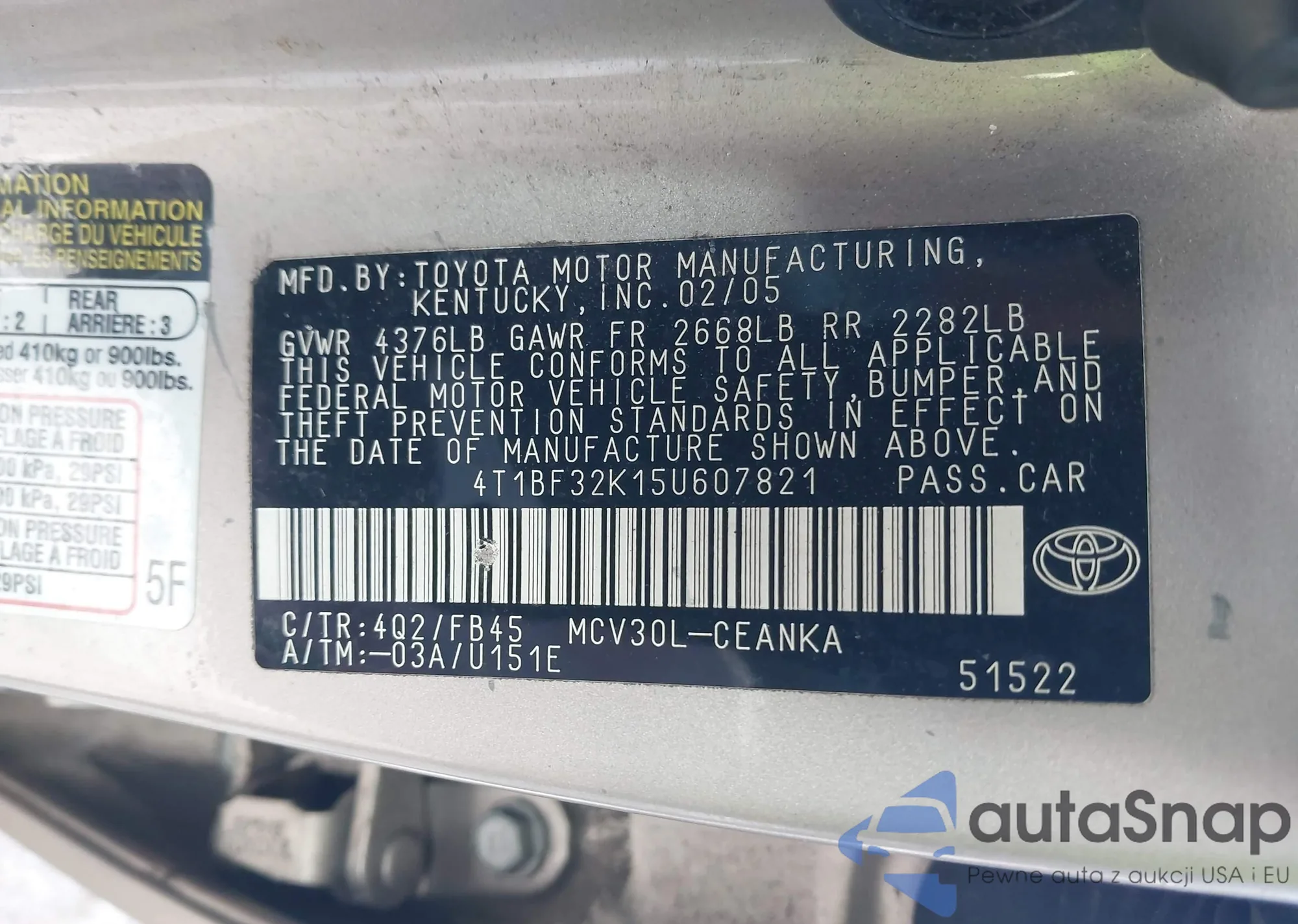 • VIN 4T1BF32K15U607821