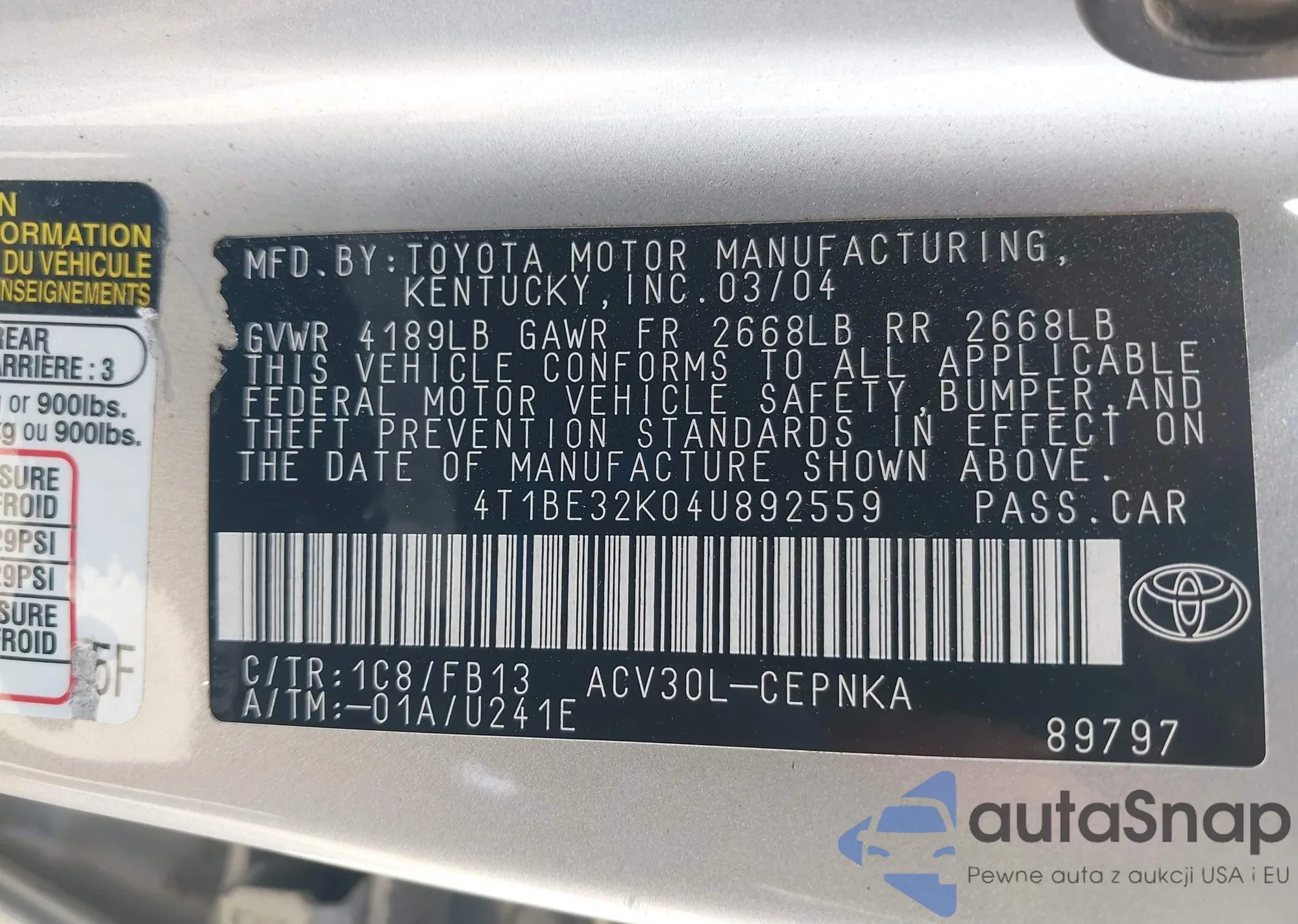 • VIN 4T1BE32K04U892559