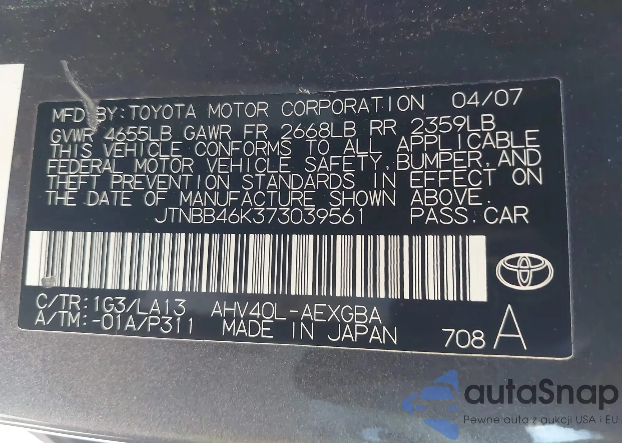 LOT: 43925219 VIN: JTNBB46K373039561