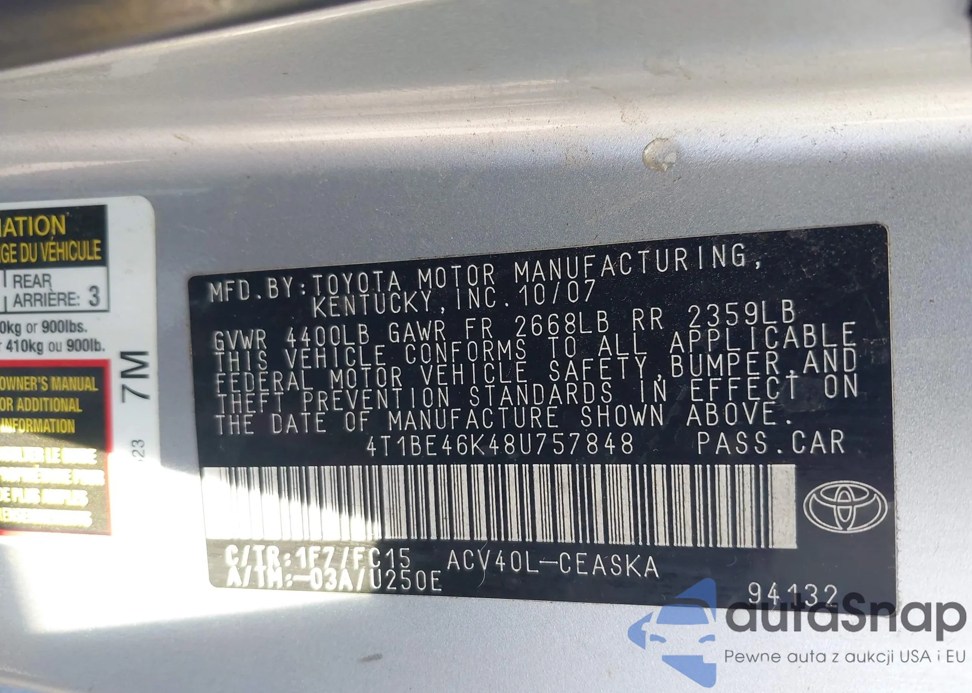 LOT: 44148418 VIN: 4T1BE46K48U757848
