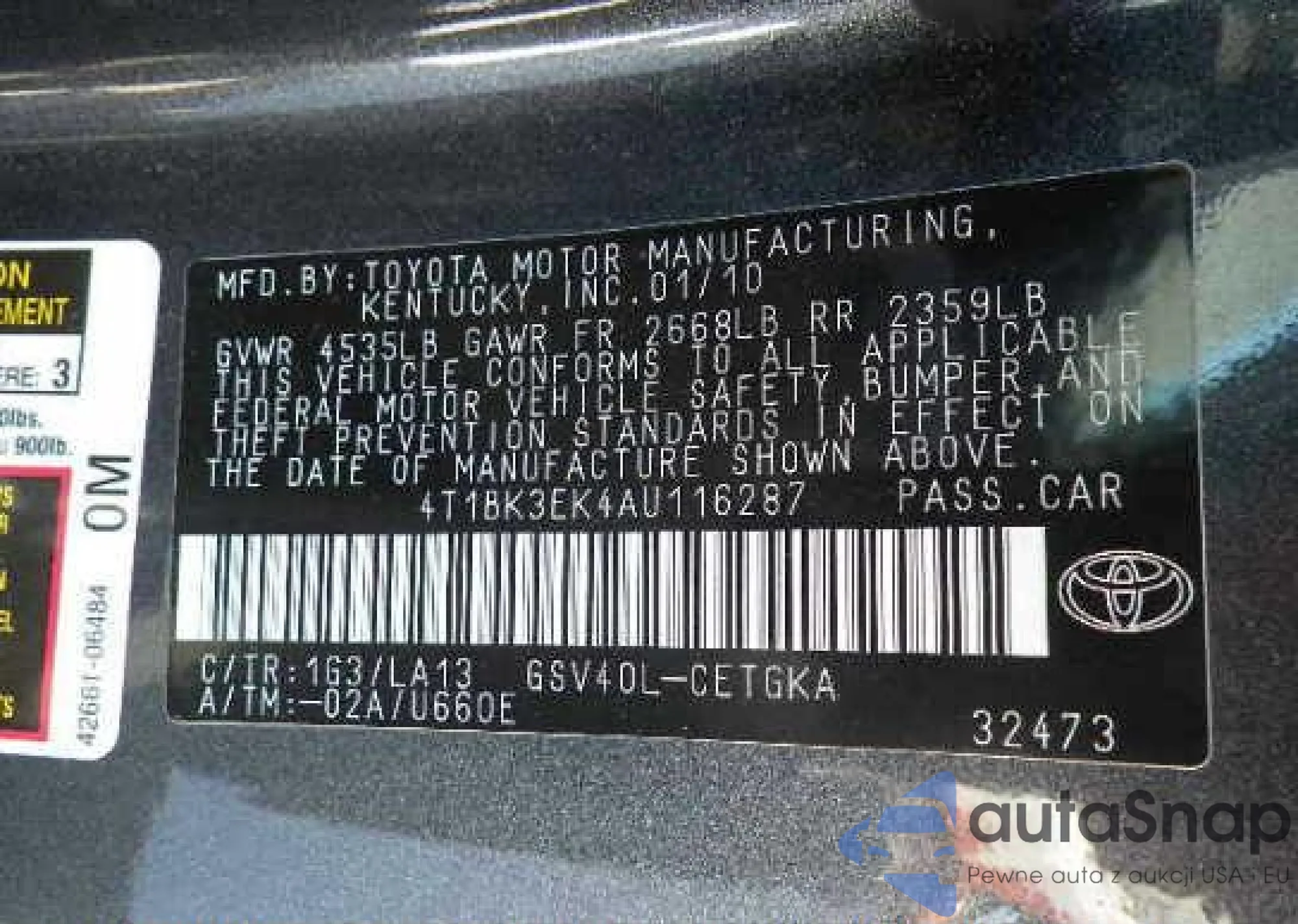 • VIN 4T1BK3EK4AU116287