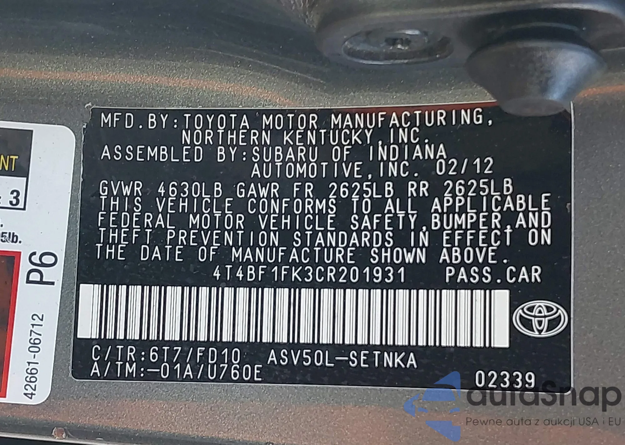 • VIN 4T4BF1FK3CR201931