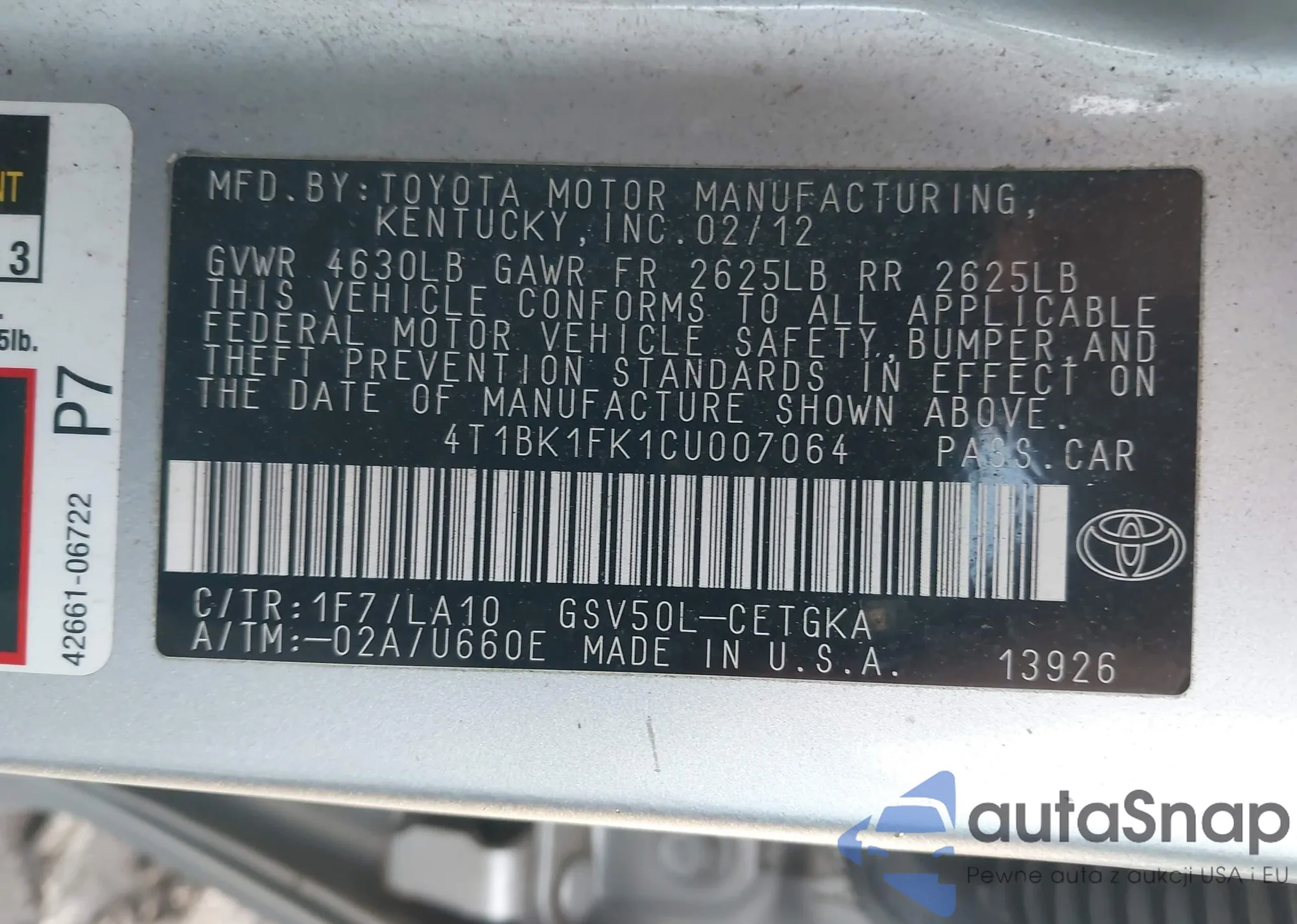• VIN 4T1BK1FK1CU007064