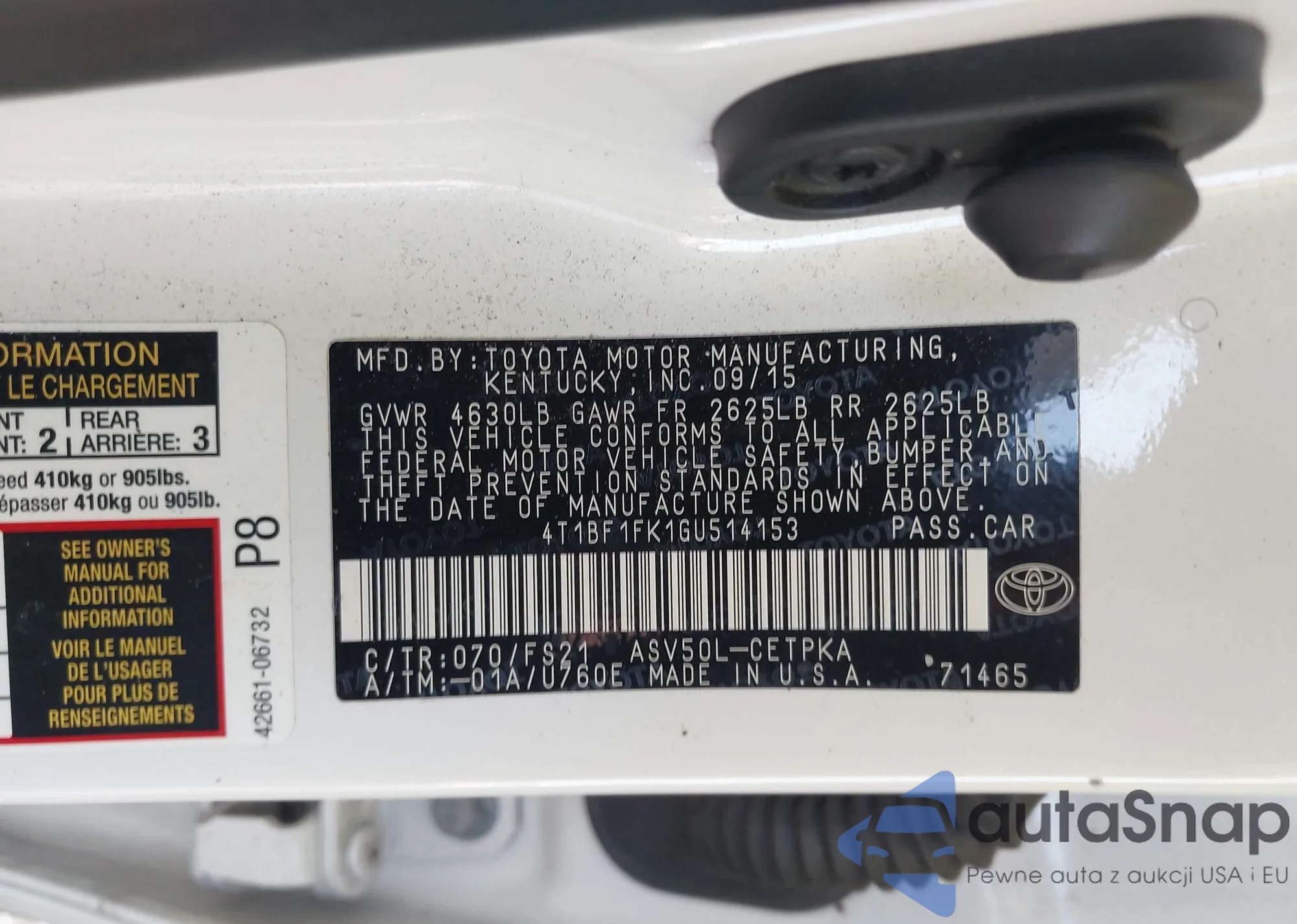 • VIN 4T1BF1FK1GU514153