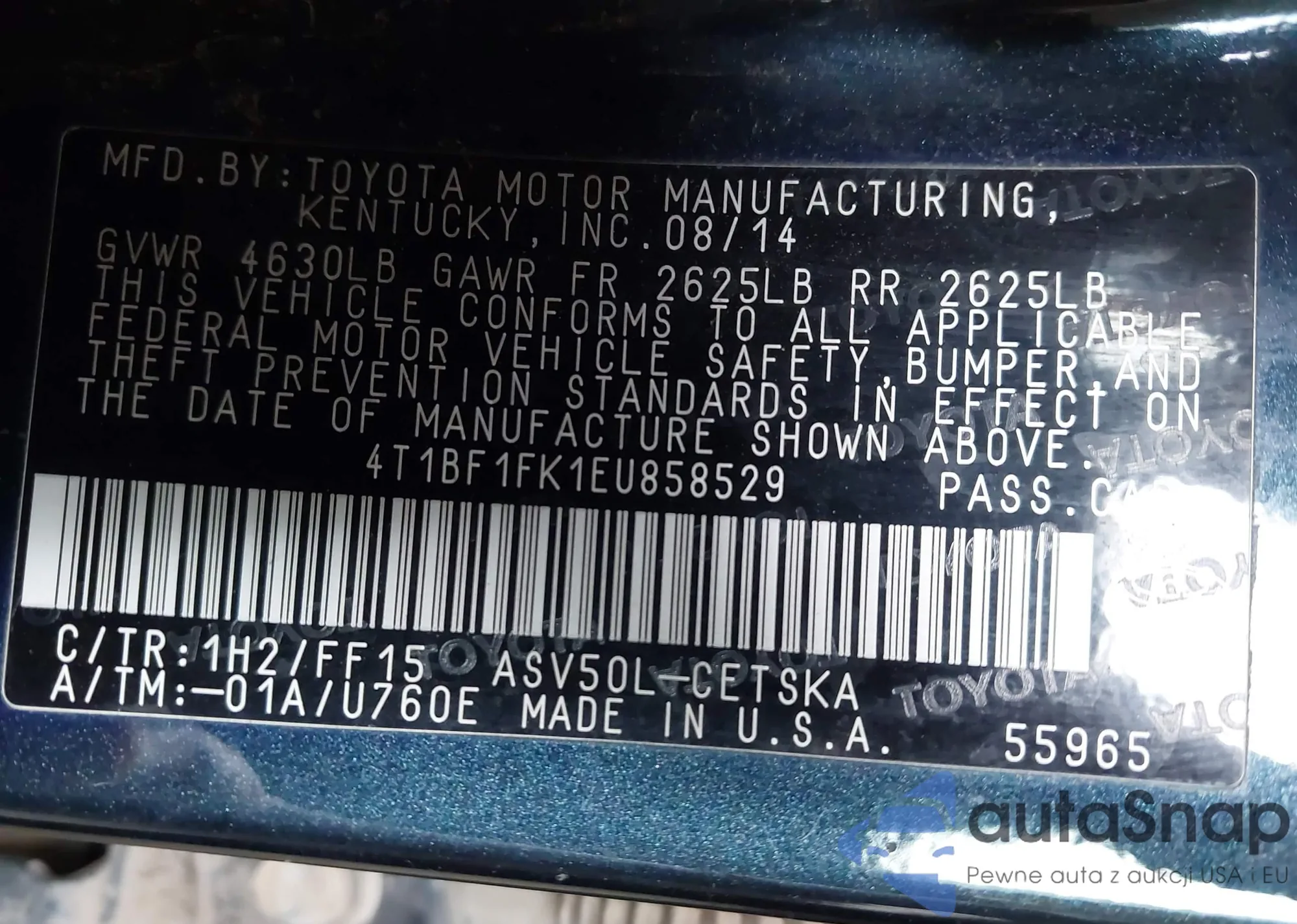 • VIN 4T1BF1FK1EU858529