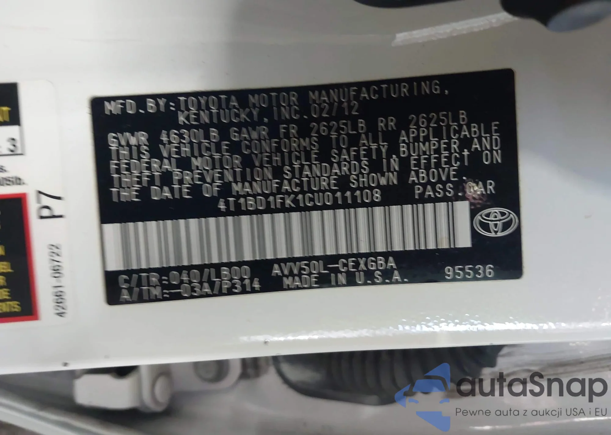 • VIN 4T1BD1FK1CU011108
