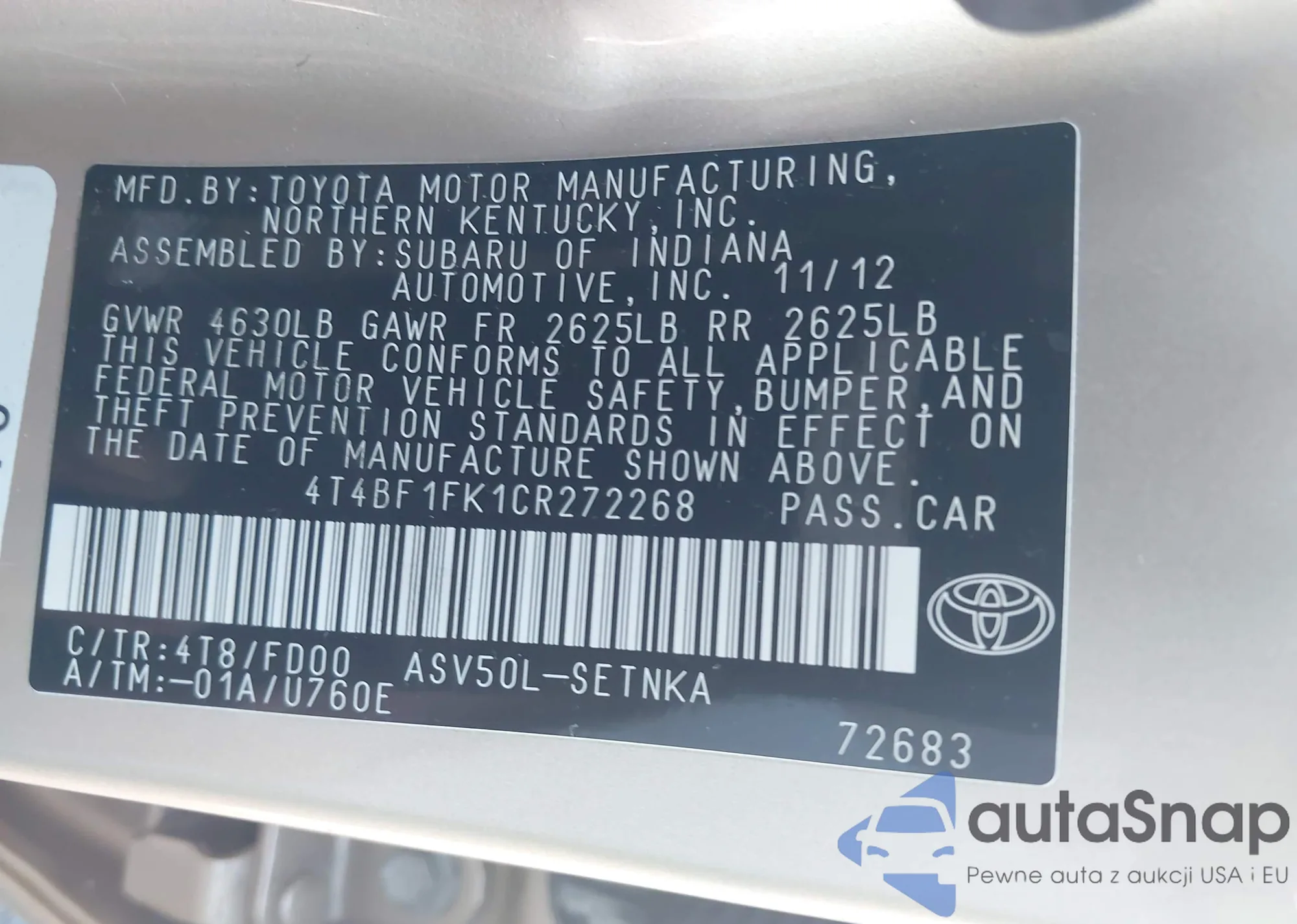 • VIN 4T4BF1FK1CR272268