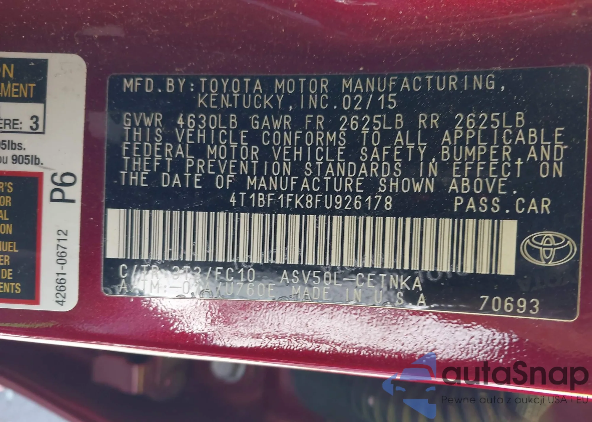 • VIN 4T1BF1FK8FU926178