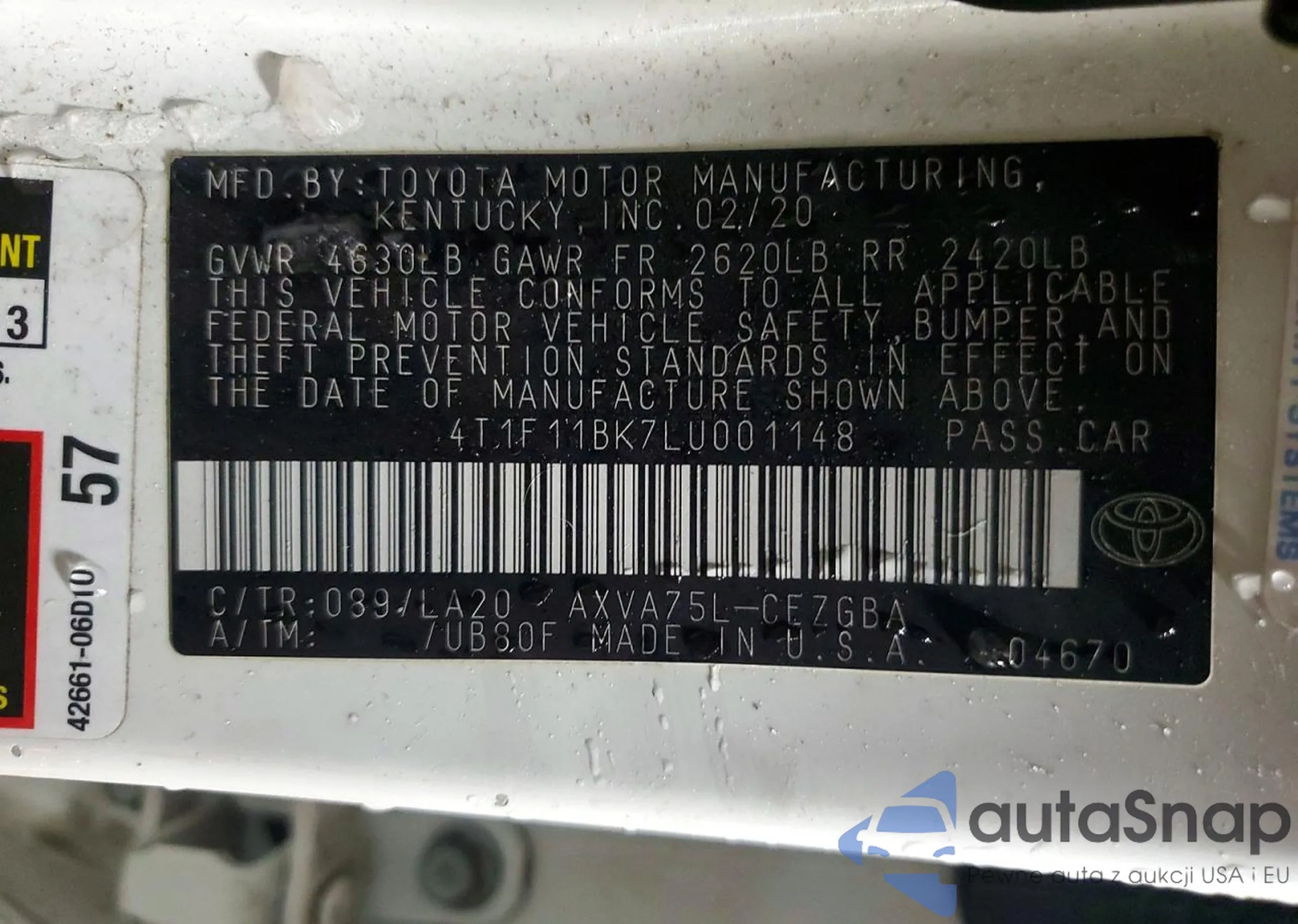 • VIN 4T1F11BK7LU001148