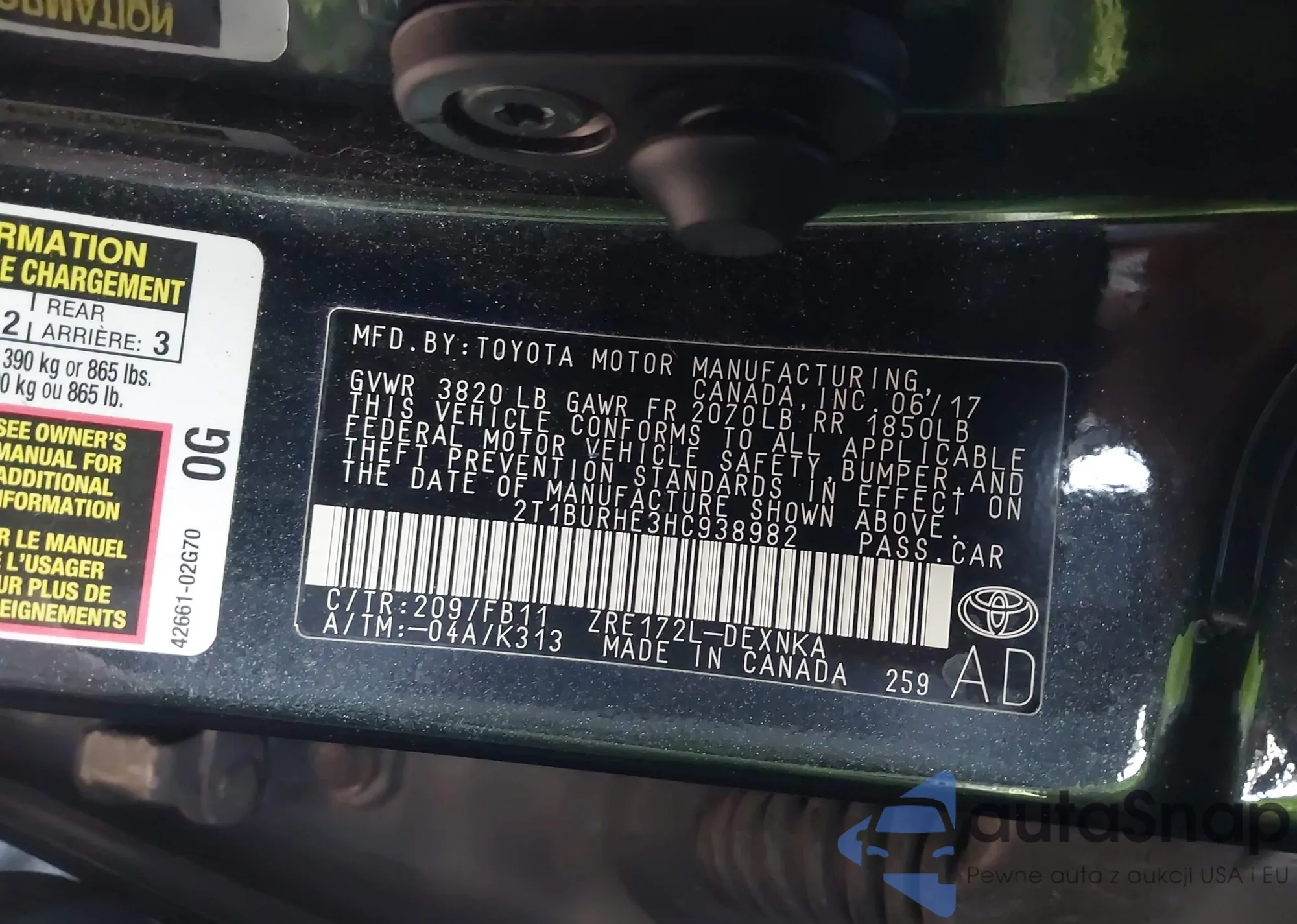 LOT: 44202814 VIN: 2T1BURHE3HC938982
