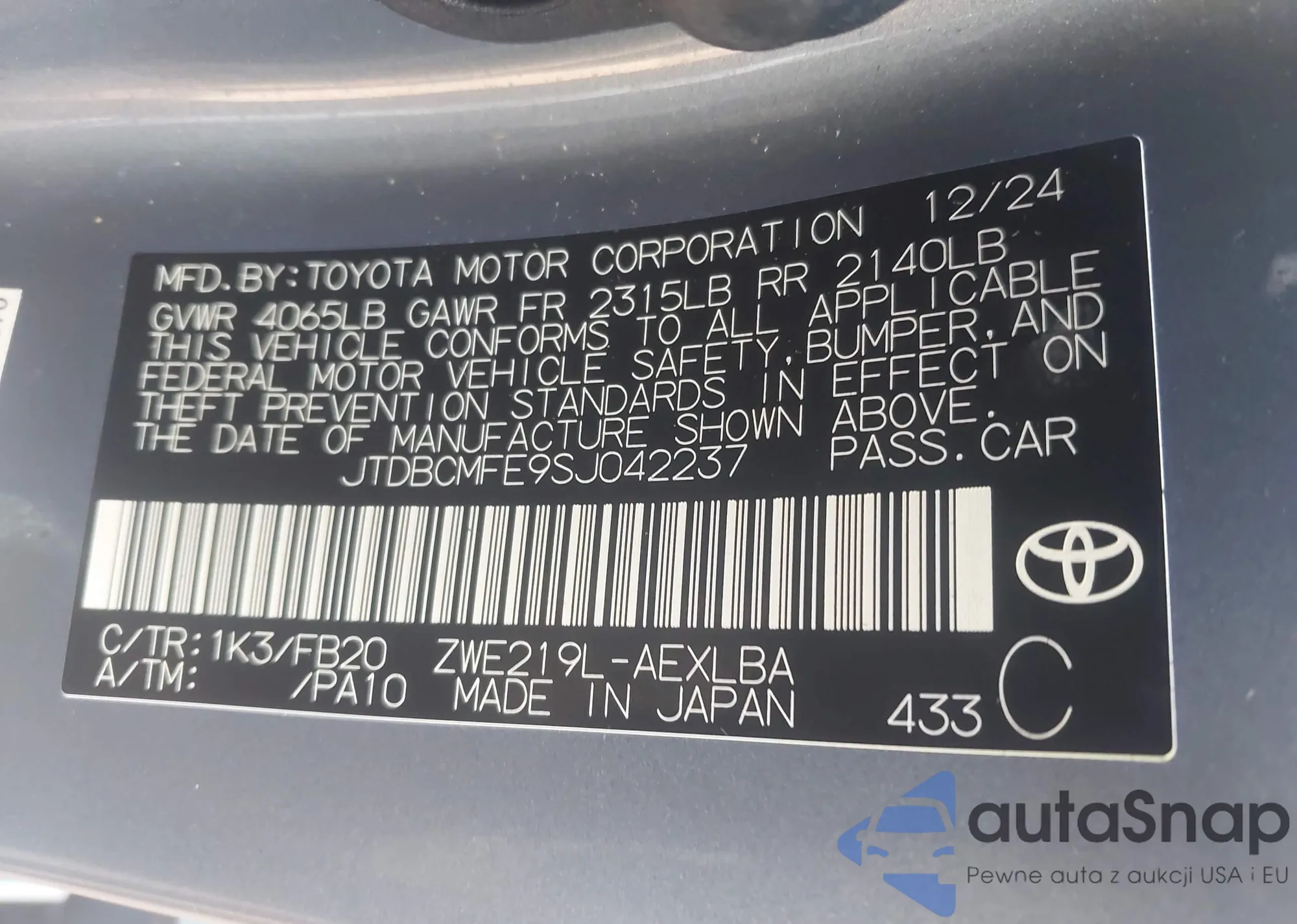 LOT: 43758143 VIN: JTDBCMFE9SJ042237