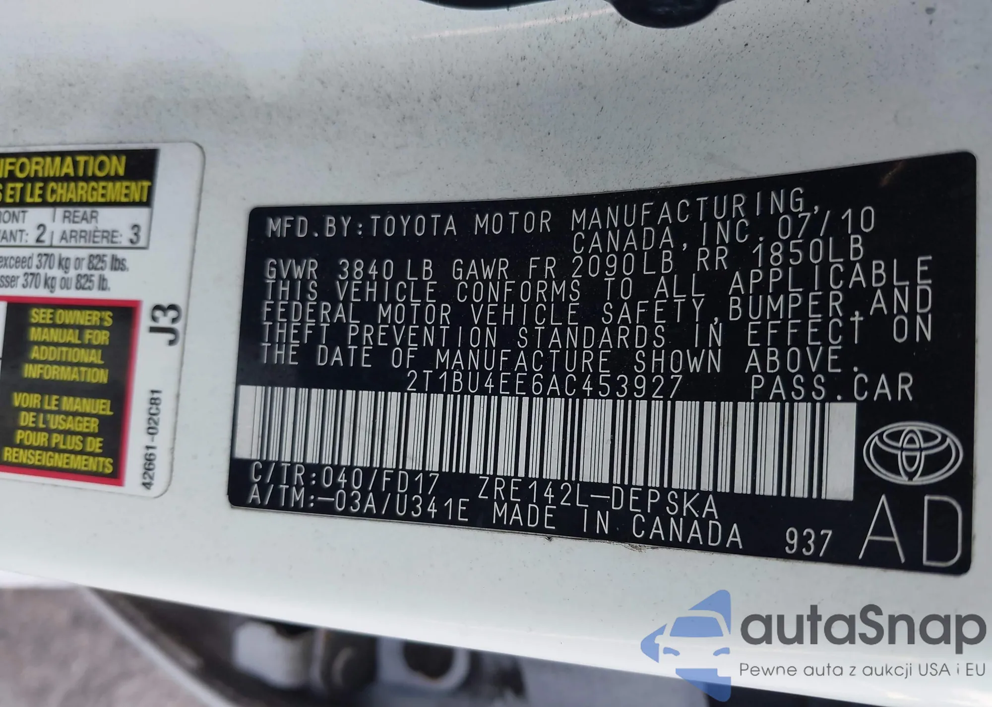 • VIN 2T1BU4EE6AC453927