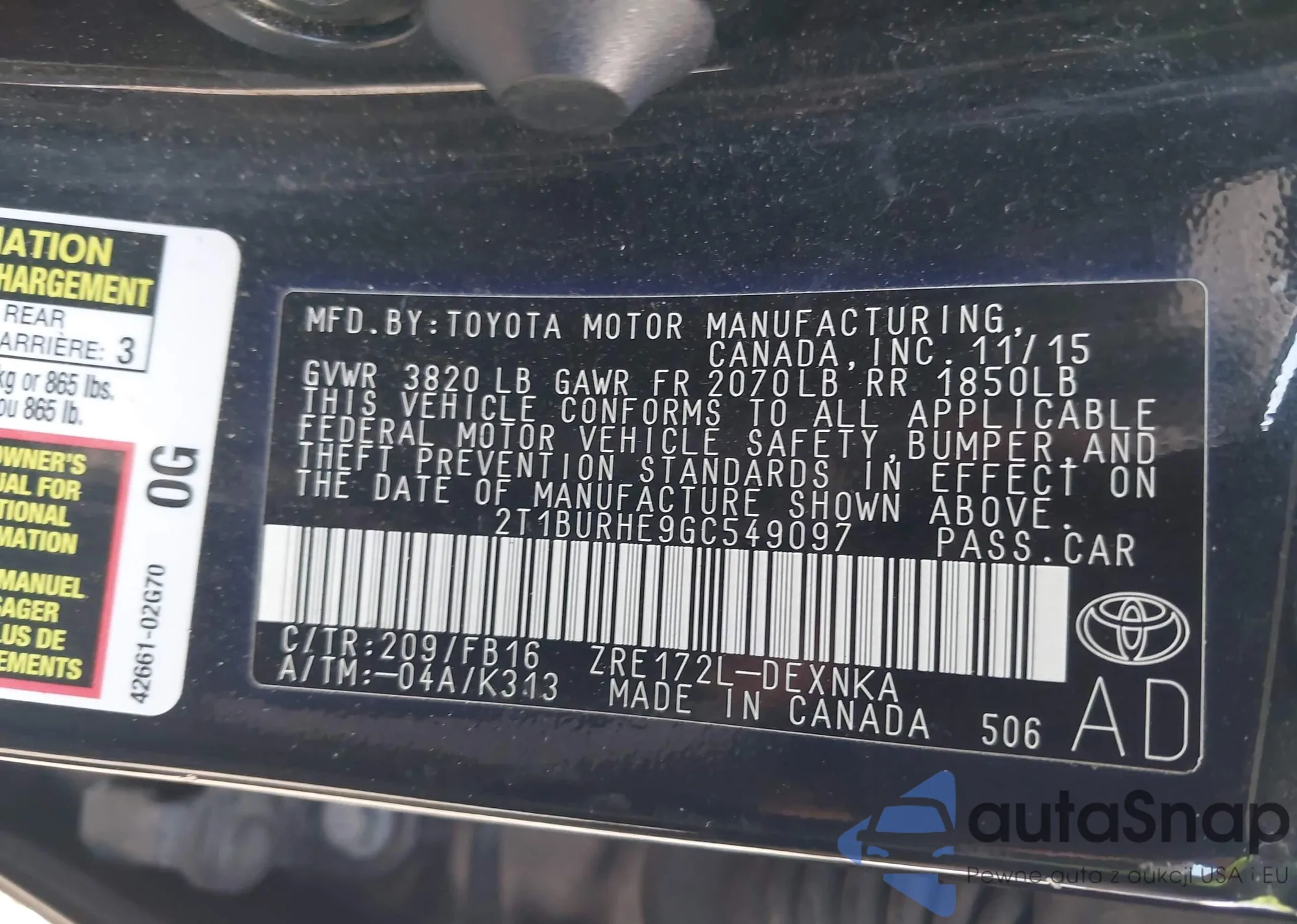 LOT: 42976551 VIN: 2T1BURHE9GC549097