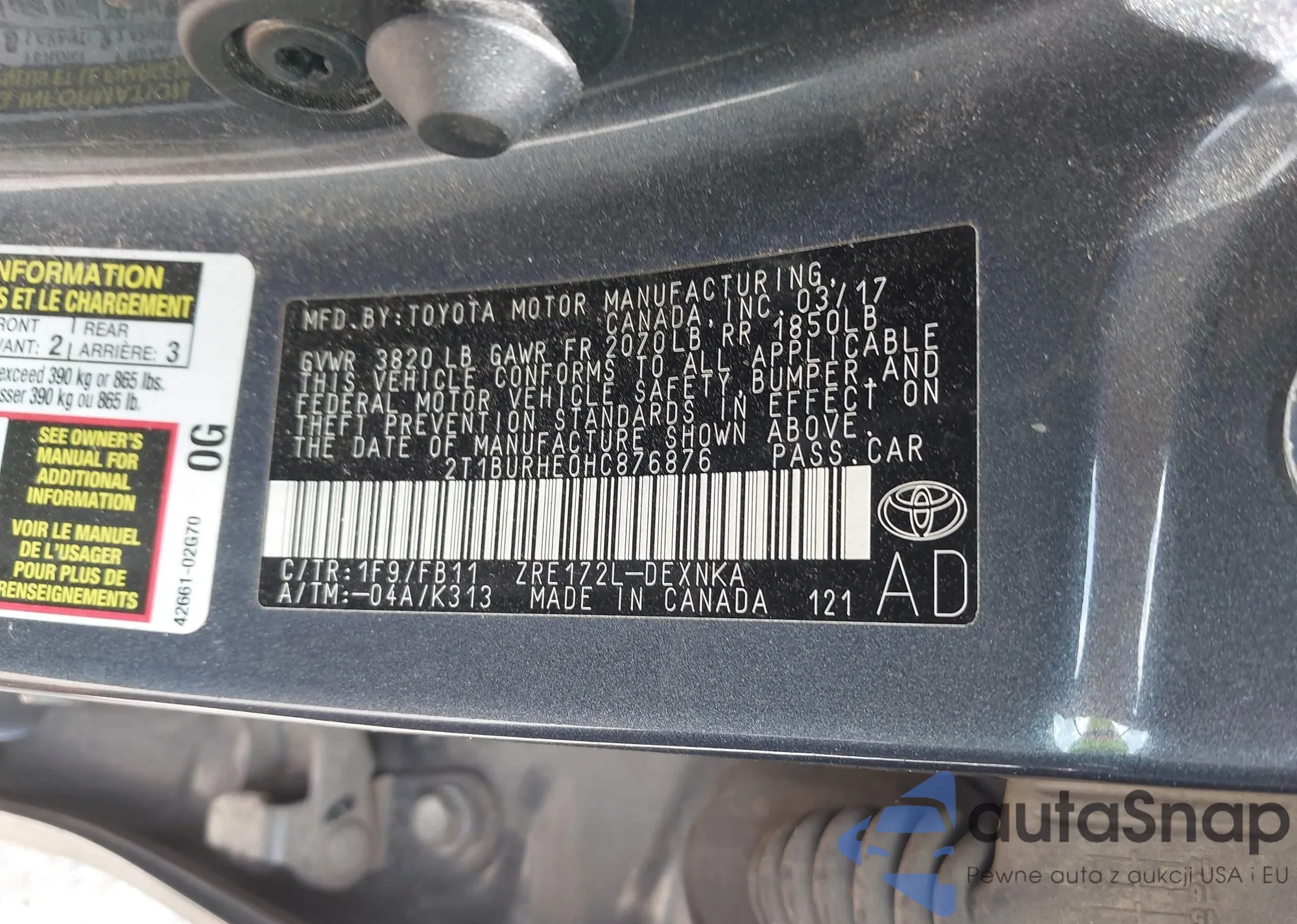 LOT: 43010288 VIN: 2T1BURHE0HC876876