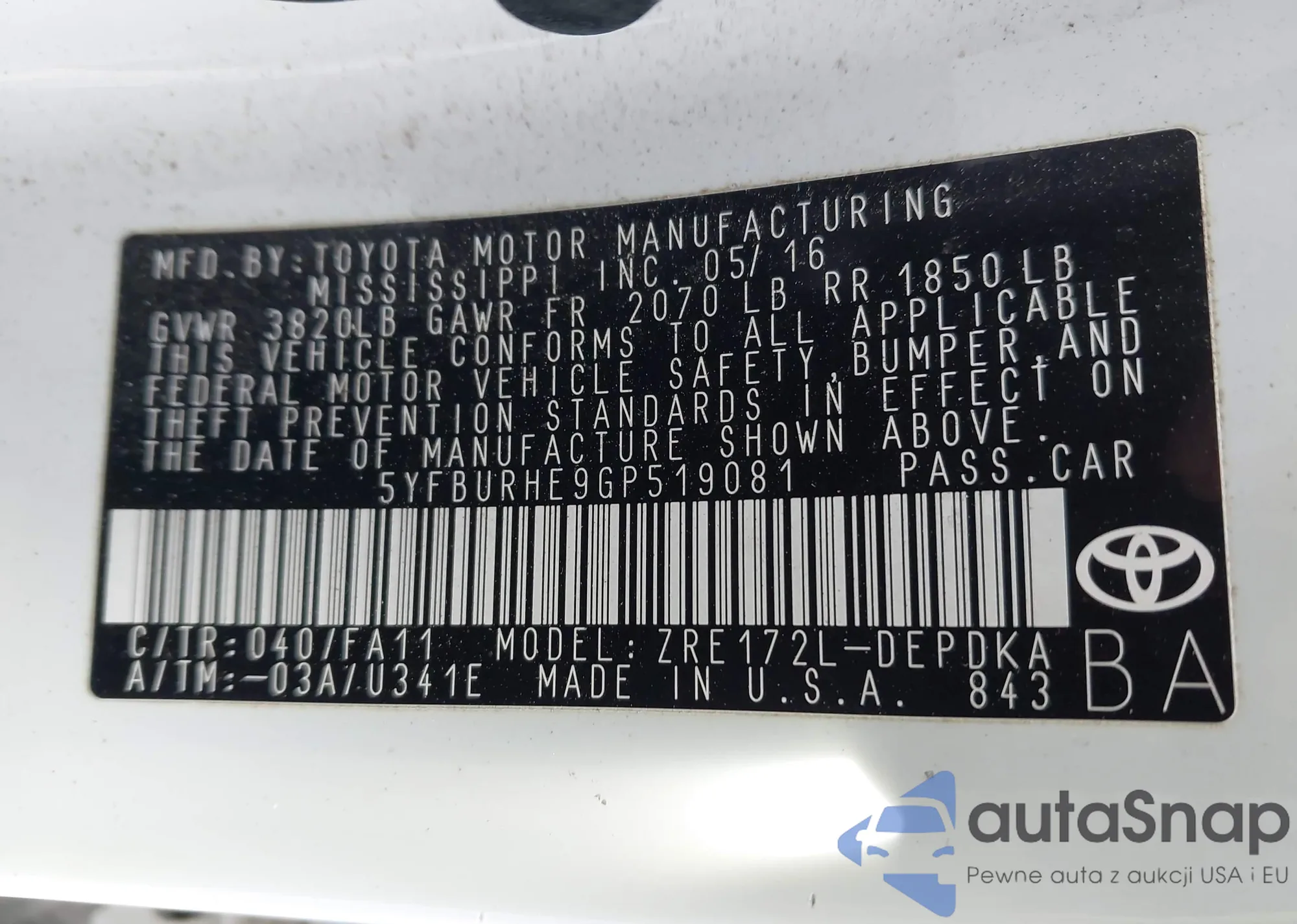 • VIN 5YFBURHE9GP519081