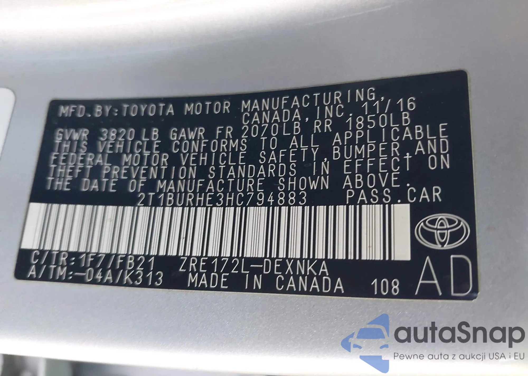 LOT: 44160242 VIN: 2T1BURHE3HC794883